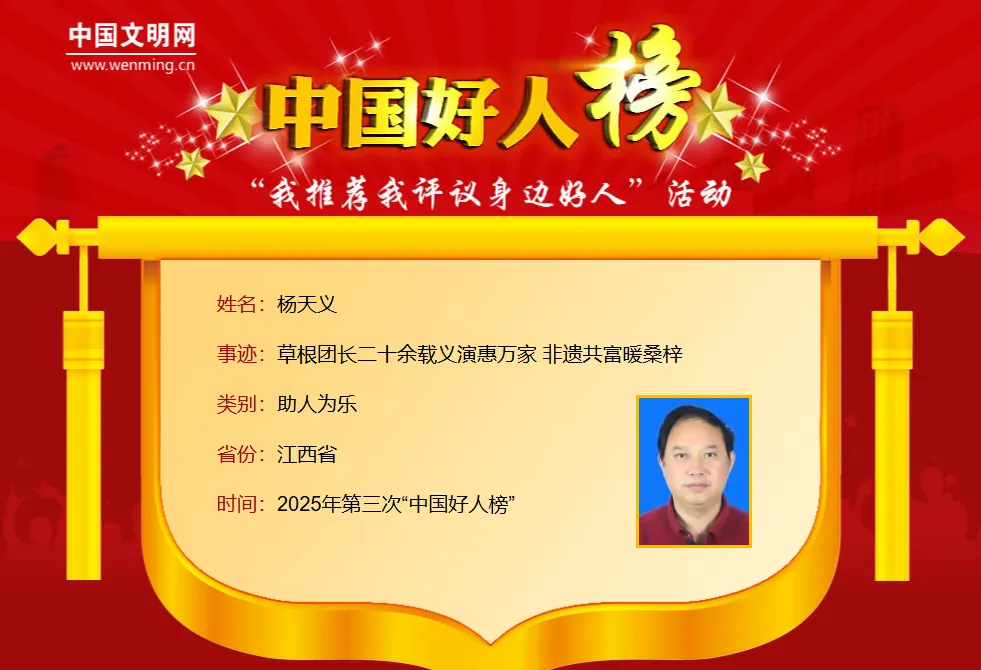 杨天义,男,1966年9月生,中共党员,江西省吉安市吉水县水南农民剧团团长。为了帮乡亲们实现“看戏梦”,杨天义倾尽所有筹集资金,建设剧院、组建剧团。20多年来,他累计免费送戏上千场,让超过百万人次的观众受益,还助力乡亲们登上了央视舞台。杨天义潜心钻研技艺,成了市级非物质文化遗产“水南腐竹”的传承人。他创办腐竹厂和合作社,带动600多户乡亲,让他们年均增收超万元,为当地群众铺就了一条“共同富裕”之路。