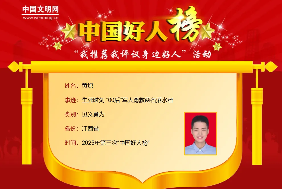 黄炽,男,2003年3月生,江西省抚州市南城县建昌镇居民。2024年4月25日,一段刷爆南城人民微信群、朋友圈和抖音的“寻找救命恩人”的视频在网上引起广泛关注。视频中两名女青年因开车操作不当冲入水库中,路过的男子两次水中救援,将两名女青年成功救上岸后默默离开。女子苦寻三天后未果,拿着救人者留下遗落下的军士证来到县退役军人事务局请求帮助,通过调取视频、照片等资料,确定了救人英雄就是南城籍军人一一黄炽。