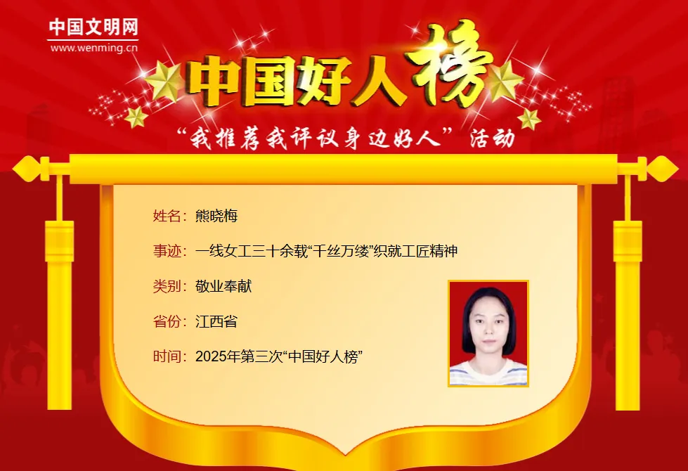 熊晓梅,女,1977年12月生,中共党员,江西省九江鑫城纺织有限公司纺纱工。熊晓梅16岁进入纺织行业,30多年来始终坚守在生产一线,从一名普通女工成长为行业技术标杆。她以“操作精细”著称,曾在40℃高温的车间环境中,创下一人同时操控12台纺机的行业传奇,成为纺织领域的“活标准”。在技术传承方面,她累计培养了100多名技术骨干,形成了完善的人才梯队,有力推动了当地纺织业的技术升级。2023年,熊晓梅当选全国人大代表,她积极开展履职工作,推动企业实施智能化改造。同时,她还持续在社区和工厂开展两会精神宣讲活动,创新采用“车间课堂”的形式,让党的创新理论更加深入人心。