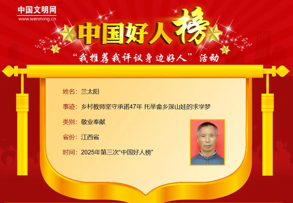 兰太阳,男,畲族,1954年11月生,中共党员,江西省抚州市乐安县金竹畲族乡流舍村退休教师。兰太阳扎根在乐安县金竹畲族乡的千米高山上,为了实现“一定要用知识把孩子们送出大山”的诺言,他倾注了全部心血。47年教学生涯中,他举债建立教学点,自掏腰包垫付学费劝说孩子们上学,即使身患重病也坚守讲台,退休后依然继续守护教育事业。在他的努力下,这个仅有37户人家的小山村,已经走出了40多名大学生。