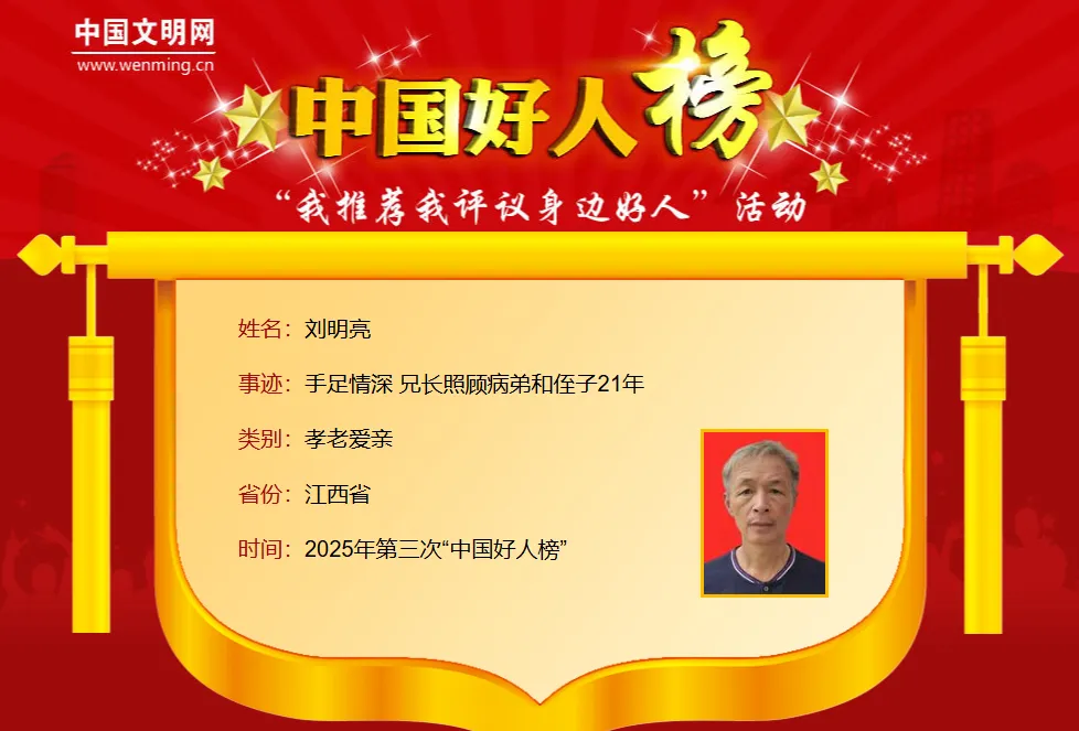刘明亮,男,1966年9月生,江西省赣州市寻乌县留车镇飞龙村村民。2004年9月,刘明亮的弟媳因生产引发重病不幸去世,弟弟刘运泉因承受不住打击患上精神分裂症,刚出生的侄子还嗷嗷待哺。面对困境,刘明亮毫不犹豫地将侄子接回家中抚养,同时承担起照顾弟弟的重担。后来,侄子顺利考上大学,弟弟的病情明显好转。这段跨越21年的坚守,生动诠释了手足情深的真谛。