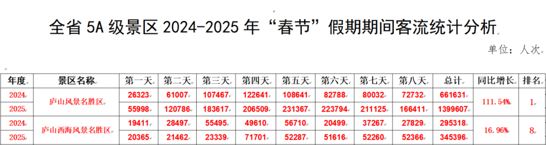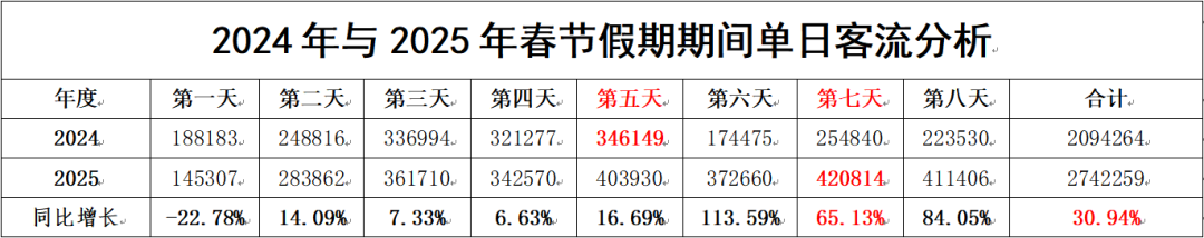 根据省文旅厅大数据平台数据分析,2024年“春节”与2025年“春节”假期单日客流数据相比,假期八天客流数据趋于增长趋势,2025年“春节”假期第七天最高。