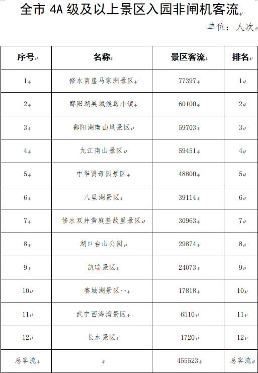 省文旅厅大数据平台入园非闸机客流进入过全省前15名的4A级以上景区有5家:修水南崖马家洲景区(77397人)、鄱阳湖吴城候鸟小镇景区(60100人)、鄱阳湖南山风景区(59703人)、九江南山景区(59451人)、中华贤母园景区(48800人)。