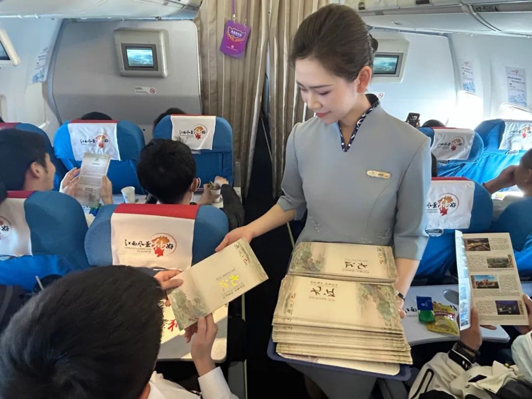 客舱内,九江文旅、庐山和庐山西海景区的精美折页随处可见。乘客随手翻阅,便能提前饱览九江秀美的自然风光与深厚的历史底蕴,仿佛已漫步在九江的山水之间。