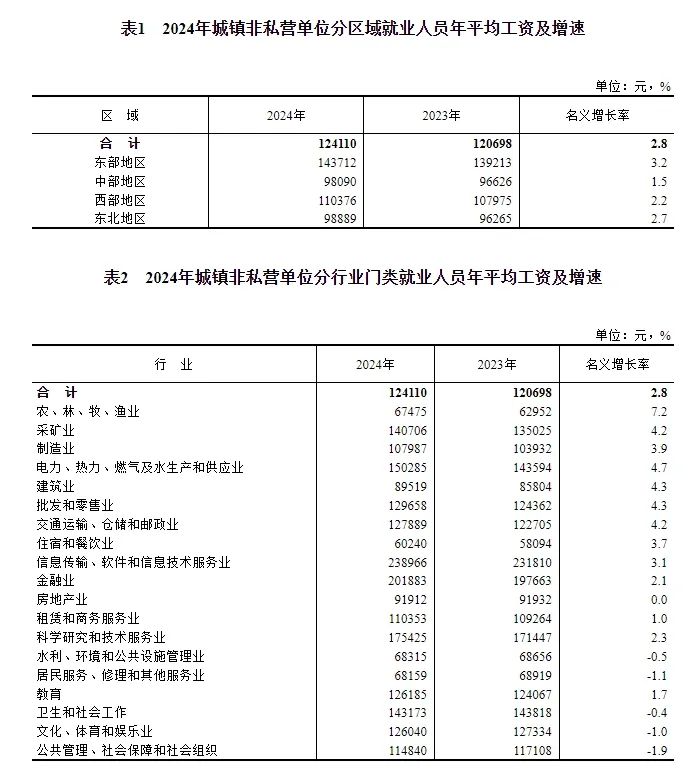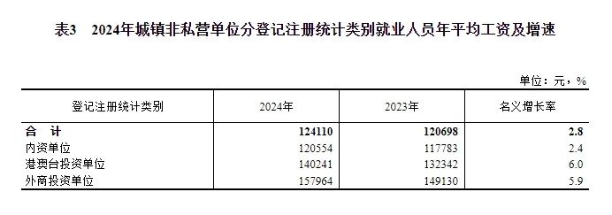 2024年,全国城镇非私营单位就业人员年平均工资124110元,比上年增加3412元,名义增长2.8%,按可比口径增长2.6%。