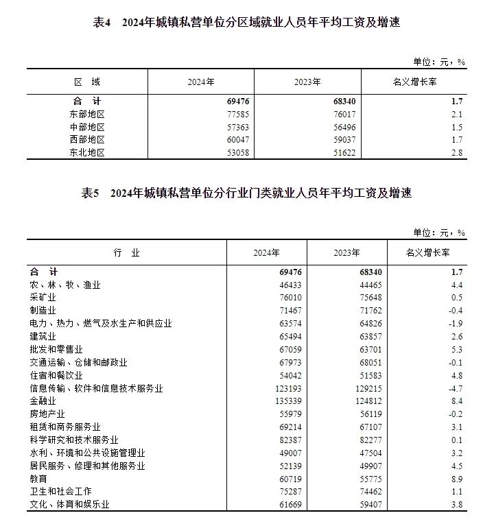 2024年,全国城镇私营单位就业人员年平均工资69476元,比上年增加1136元,名义增长1.7%,按可比口径增长4.0%。