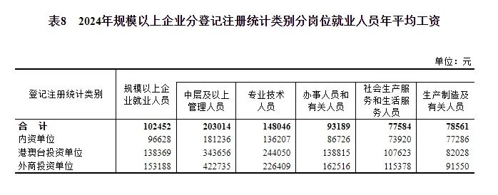2024年全国城镇非私营单位和私营单位就业人员年平均工资分别为124110元和69476元;规模以上企业就业人员年平均工资为102452元,其中,中层及以上管理人员203014元,专业技术人员148046元,办事人员和有关人员93189元,社会生产服务和生活服务人员77584元,生产制造及有关人员78561元。