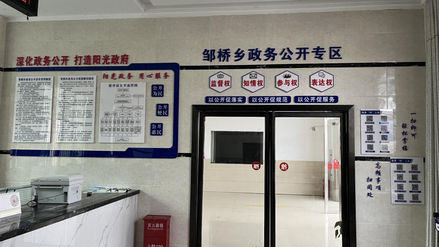 邹桥乡政务公开专区设立在便民服务大厅,主要提供政府信息查询、信息公开申请、政务自助办理、互动展示功能,增加重要政策现场解读、办事流程演示等服务。依托政务公开专区,组织开展“机关开放月”活动,定期组织队伍宣讲解读政策,现场解答企业和群众关心的问题。不断推进政务公开工作增效,助推政务公开与企业、群众需求对接,切实提高群众满意度与获得感。