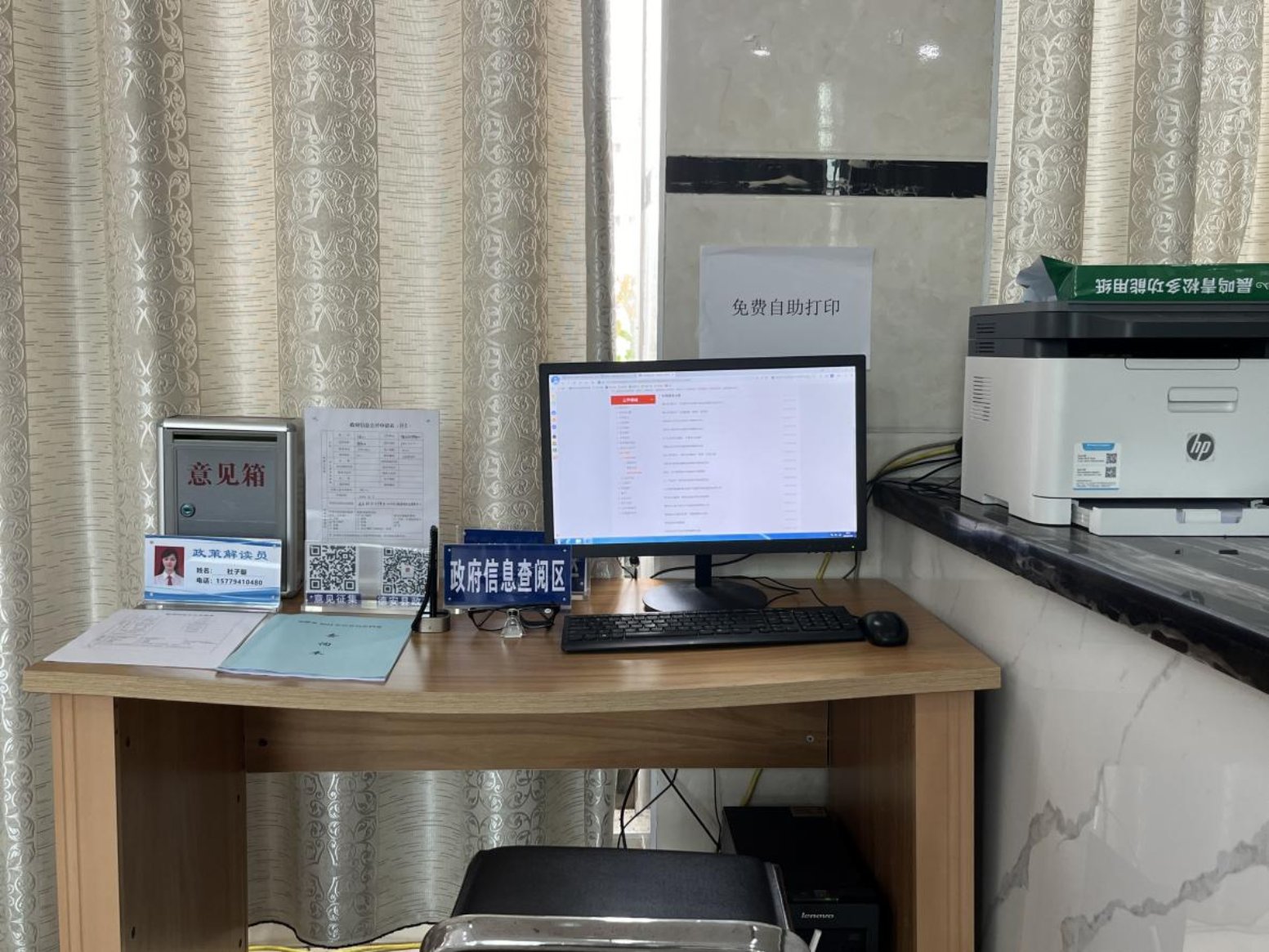 提供政府信息线上、线下查阅服务。线上提供1台电脑和1台打印机等信息化设备,精确定位政务公开网址,线下借助展柜摆放历年政府公报、政府工作报告、政府公开年报、便民服务手册、政府信息公开指南等材料,采购政务公开相关书籍,方便群众了解本地政务公开工作。