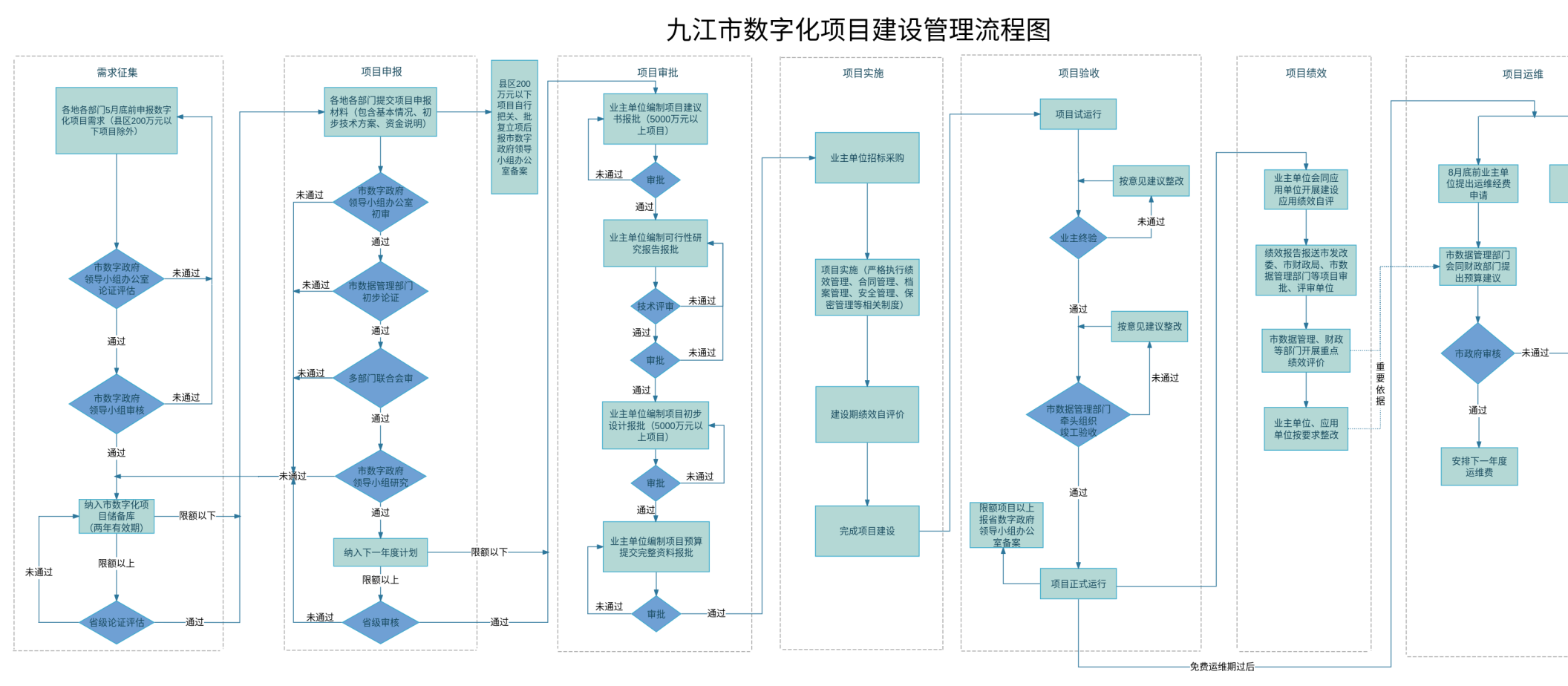 第五条 市数据管理部门按照机构改革确定的职责,负责数字化项目的规划、咨询论证、技术评审、竣工验收、监管等工作;会同有关部门建立数字化项目咨询论证机制、联合会审机制,协调解决有关问题,开展督促检查和评估评价;负责“智慧九江”服务的认定及采购。