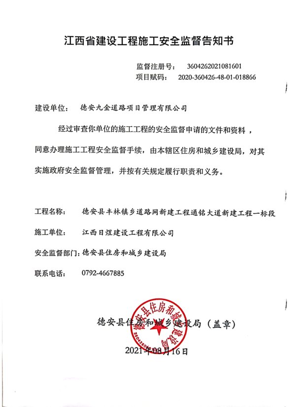 丰林镇乡道路网新建工程通铭大道新建工程一标段施工安全监督告知书