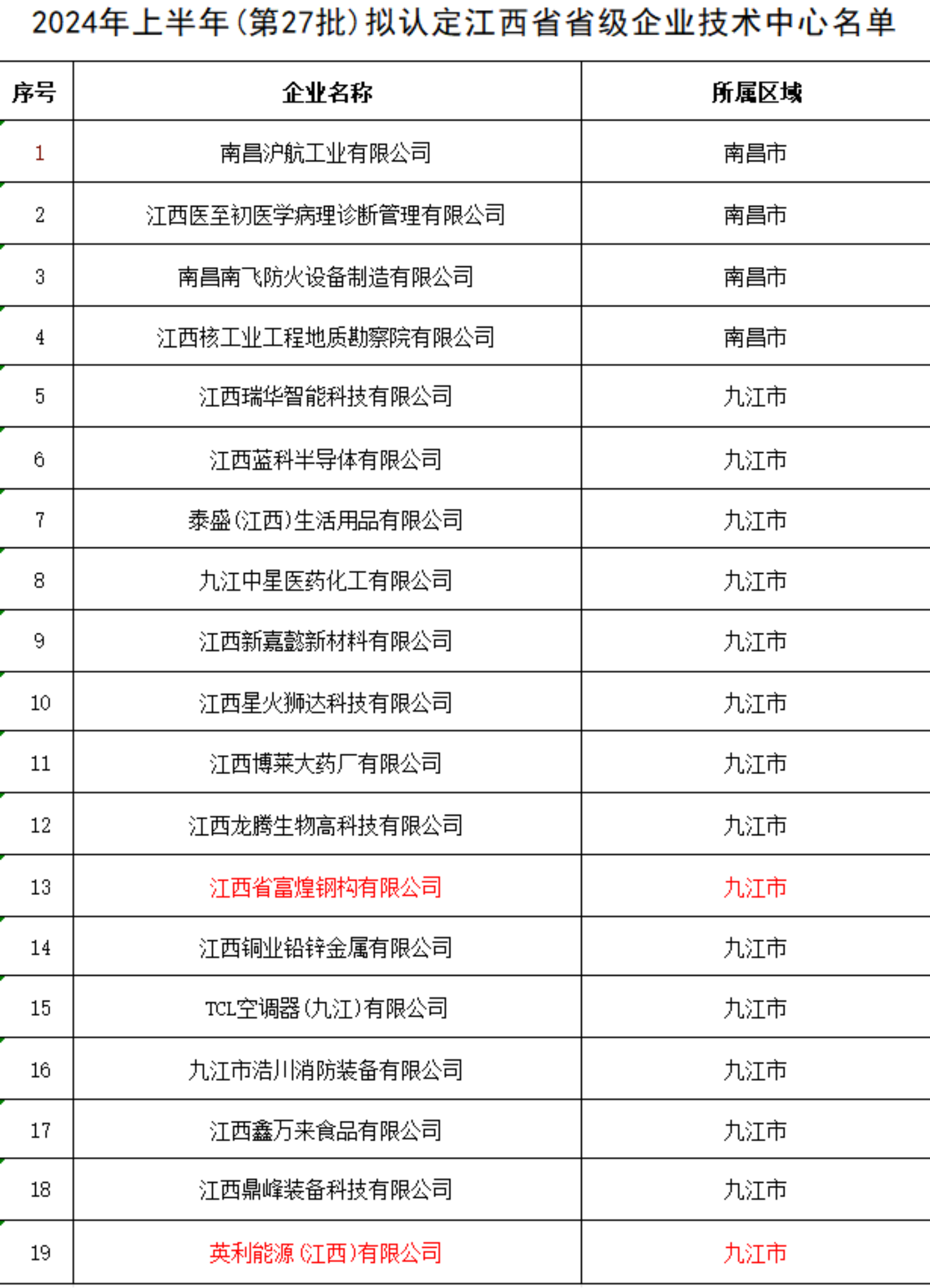 近日,江西省工业和信息化厅发布《关于拟认定2024年上半年(第27批)江西省省级企业技术中心的公示》。德安县2家企业获批,分别是江西省富煌钢构有限公司和英利能源(江西)有限公司。
