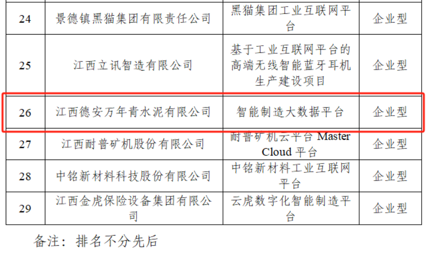 近日,江西省工业和信息化厅发布《关于2024年江西省省级工业互联网平台名单和培育名单的公示》,我县江西德安万年青水泥有限公司智能制造大数据平台入选2024年江西省省级工业互联网平台名单。