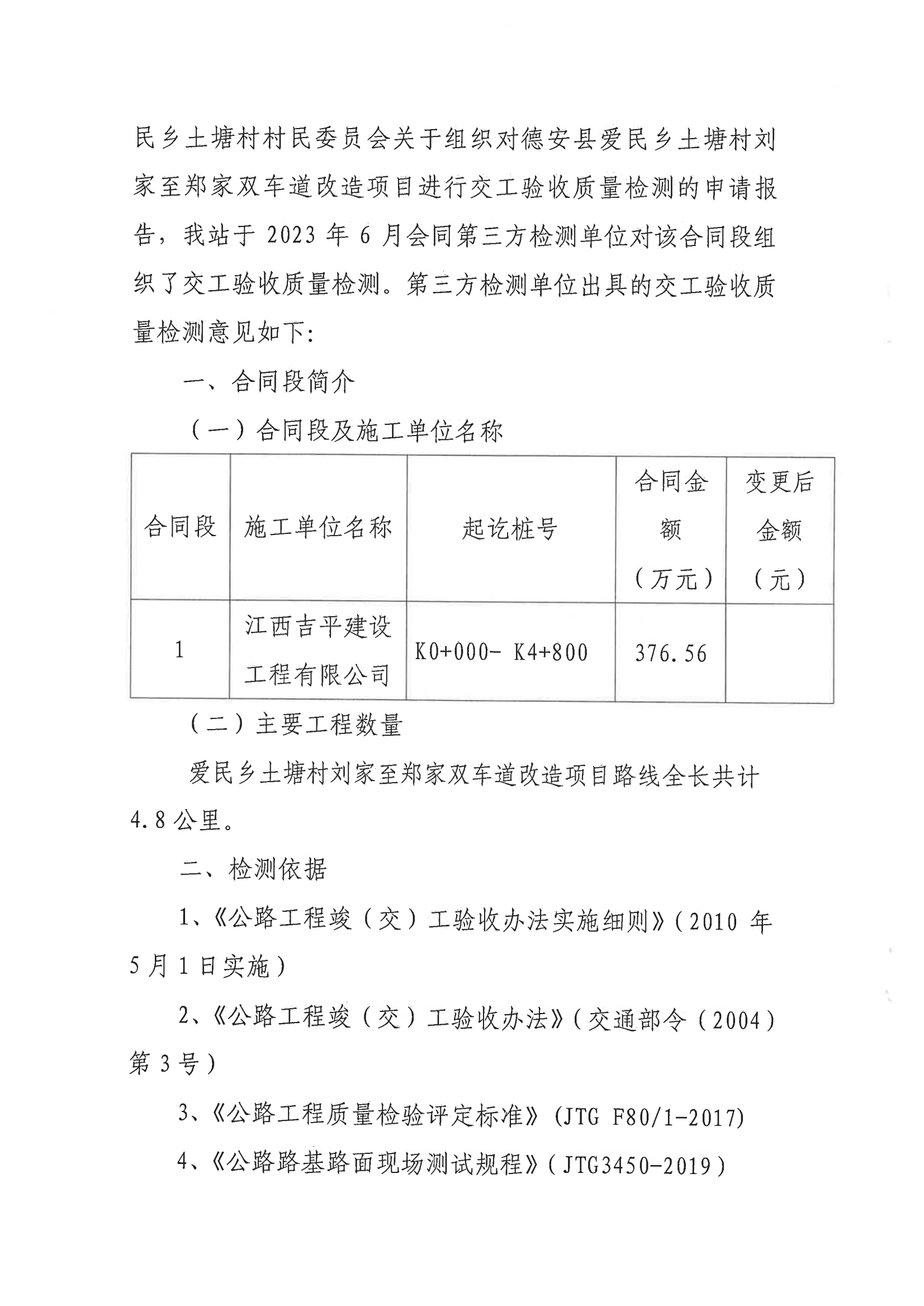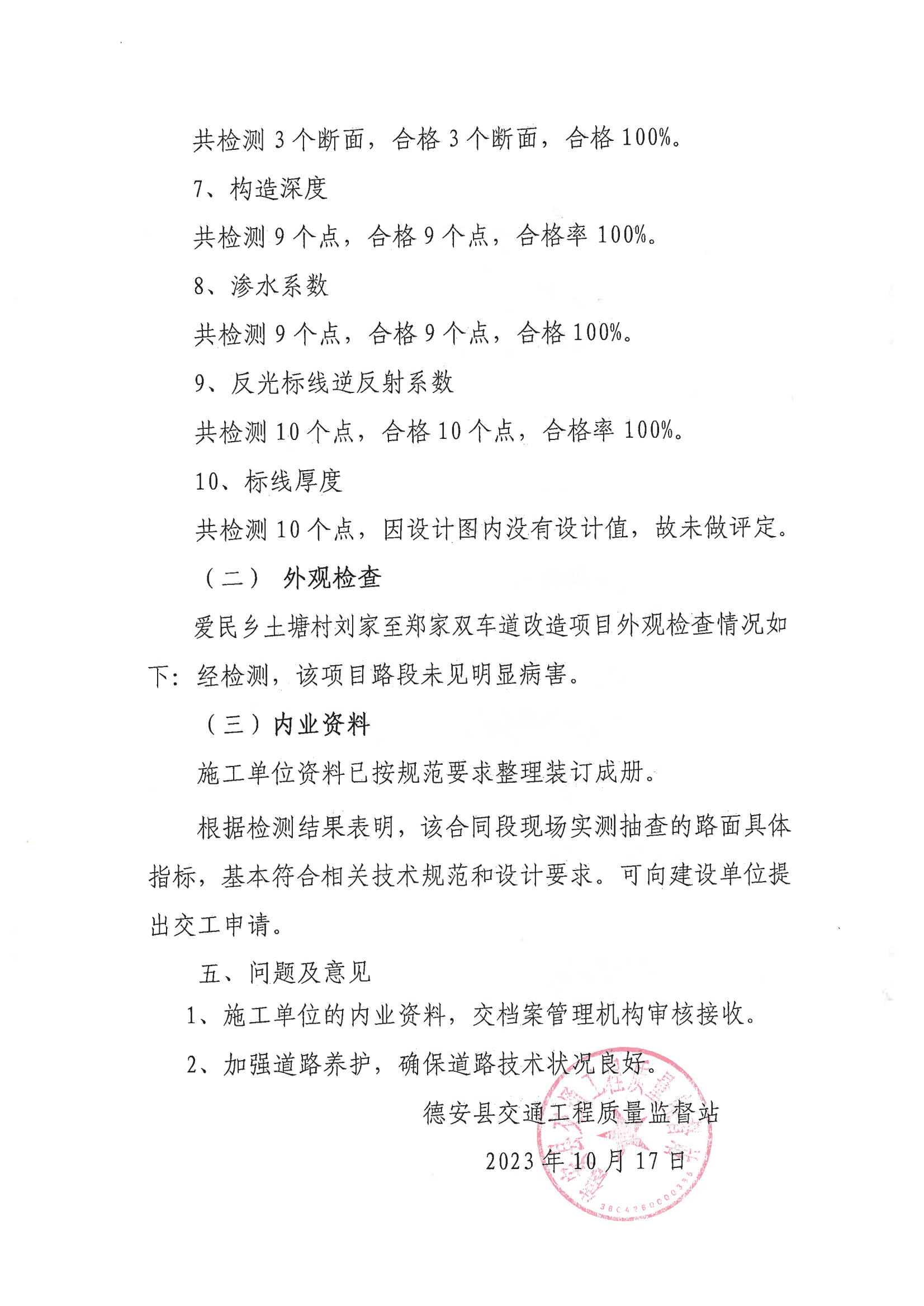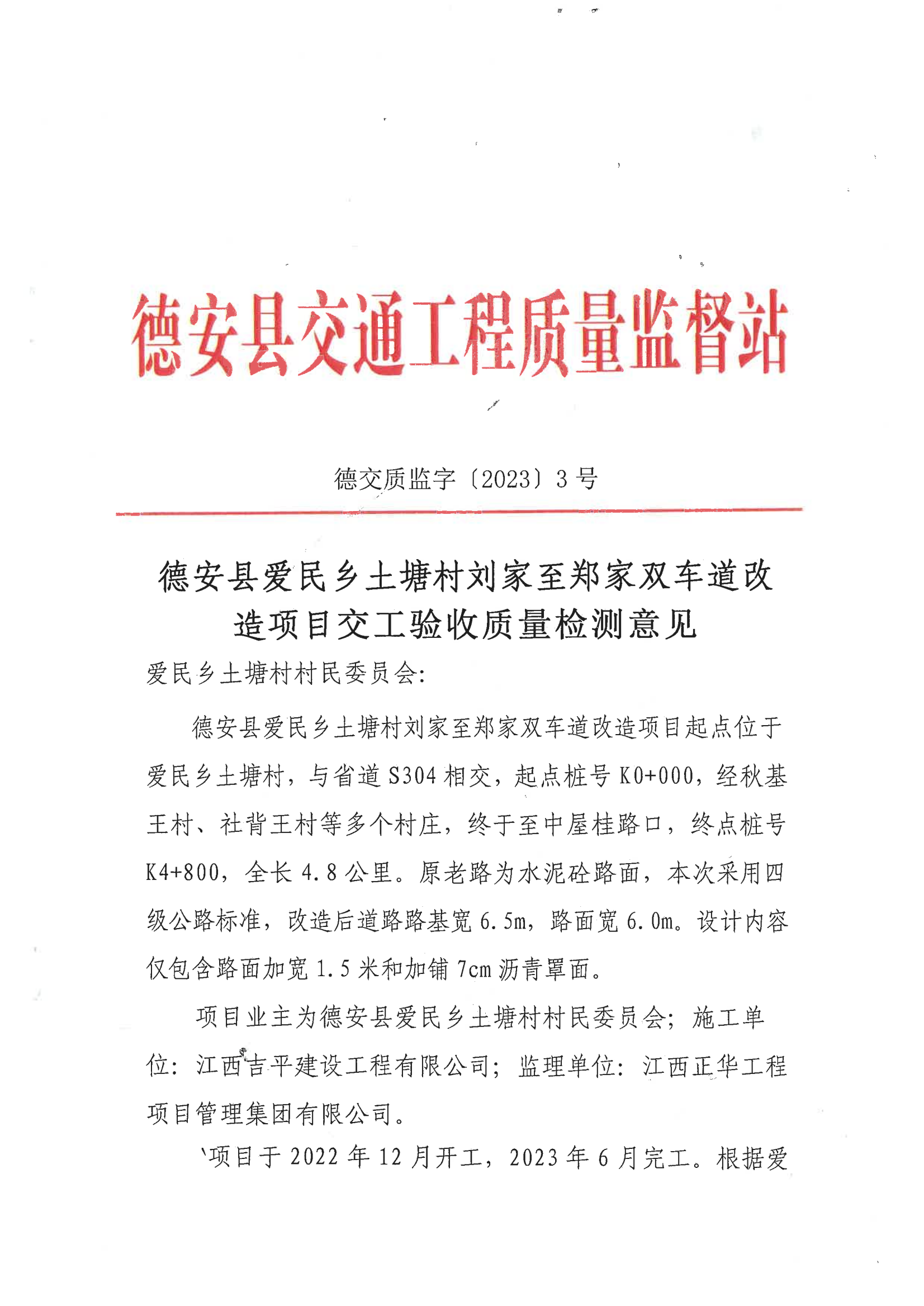 德安县爱民乡土塘村刘家至郑家双车道改 造项目交工验收质量安全监督材料