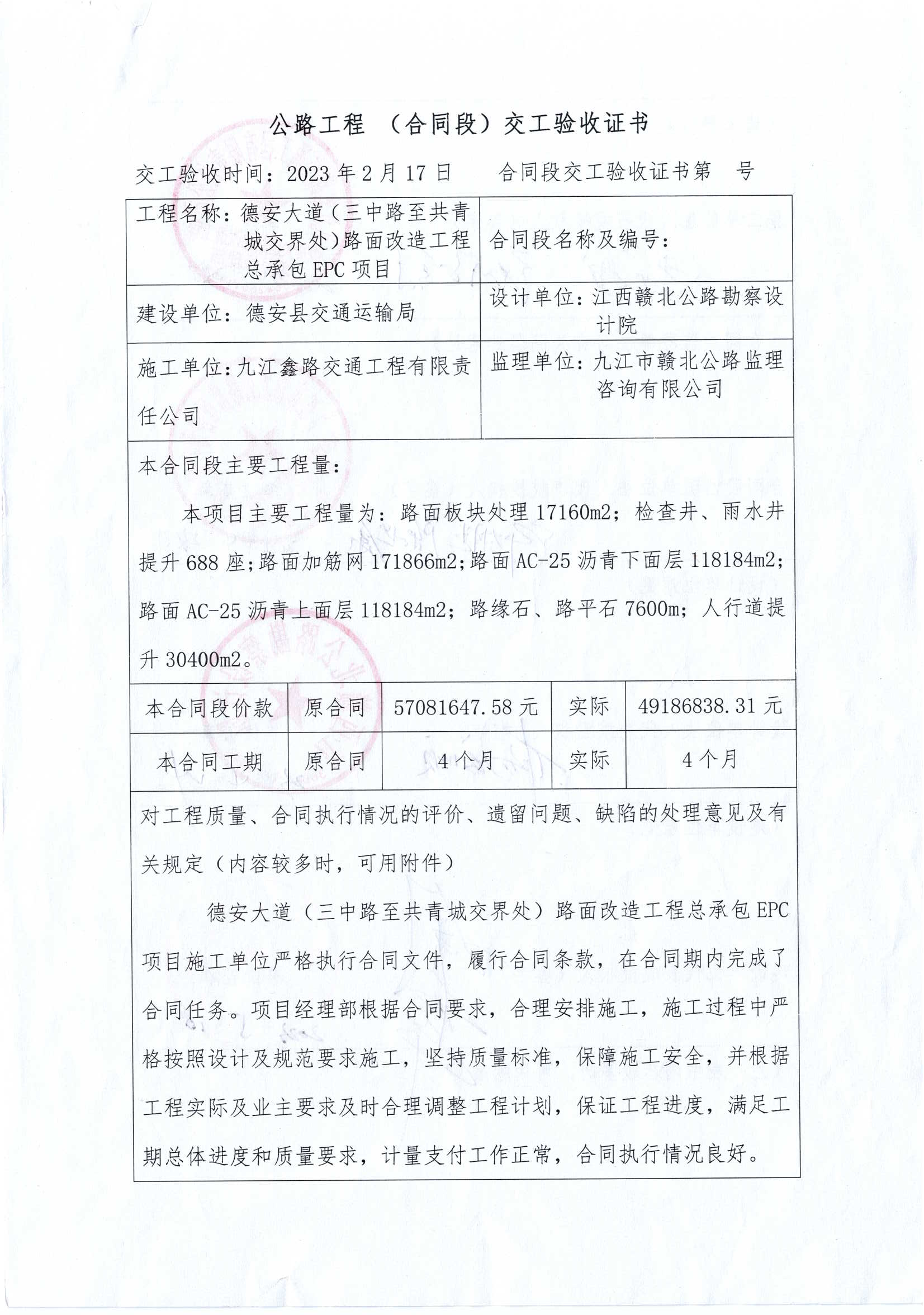 德安大道(三中路至共青城交界处)路面改造工程总承包(EPC)项目交工验收资料