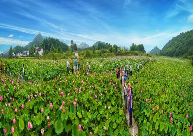 渊明故里位于德安县吴山镇蔡河村冲里陶家,距县城25公里。据清代乾隆皇帝钦定的《四库全书》第446卷第275页记载:“君生于浔阳柴桑今德安县楚城市是”。这是该丛书《绍陶錄·栗里谱》中明确指认的东晋时隐逸之宗、田园诗祖陶渊明的诞生地。蔡河村连片种植荷花600余亩,29个品种的太空荷花相继竞相绽放,万杆荷花亭亭玉立、摇曳多姿,宛如置身芙蓉仙境。勤劳的陶家人正借助“太空莲”及“渊明皇菊”种植基地,围绕陶渊明文化精髓,建设宜农、宜游的乡村特色旅游点,打造桃源式的田园梦乡。