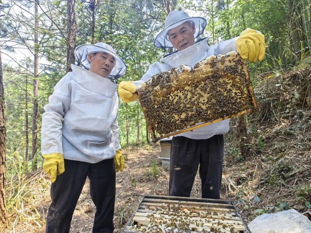 林泉乡屏峰村坐落在山脚,漫山遍野的植被宛如天然蜂场,每逢春夏,无数野蜂出没。去年,屏峰村驻村帮扶干部黄序保带领村集体在附近山林放置上百个蜂箱打造蜜蜂养殖基地,年产值超10万元,不仅壮大了村集体经济,也为农户提振了信心。20多户村民“有样学样”,也在房前屋后的灌木丛里散放蜂箱养起了蜜蜂。村民黄承应家养了10多箱,他说:“养蜂成本低、利润高,每斤蜜市场价80块左右,一年能卖上万块钱。”