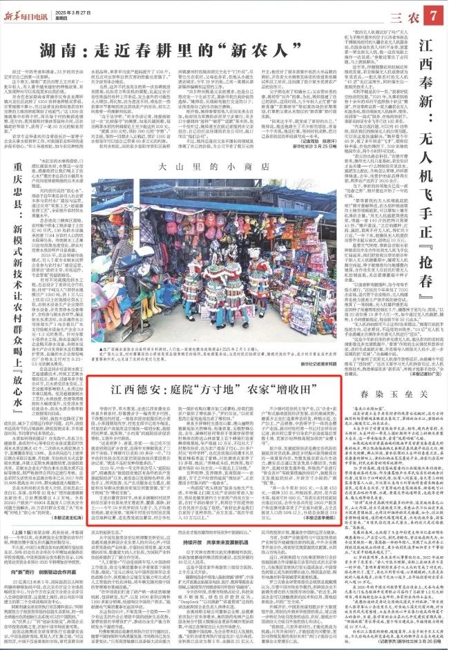 3月27日,新华每日电讯7版稿件《江西德安:庭院“方寸地” 农家“增收田”》,单条报道了近年来,德安县以发展特色种养、特色手工、休闲旅游、生产生活服务业为重点,鼓励和引导群众挖掘房前屋后闲置资源,变“方寸闲地”为“增收宝地”。