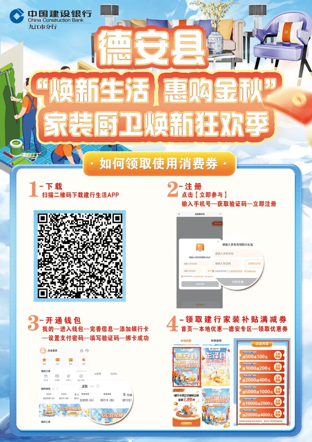 消费者实名注册并登录“建行生活”APP领取家装厨卫“焕新”补贴消费券。在参与补贴的商家选购相关补贴品类产品,结算付款时系统将自动核销优惠补贴券。消费者不能将补贴范围内商品与其他非活动商品一同付款,否则无法享受补贴。