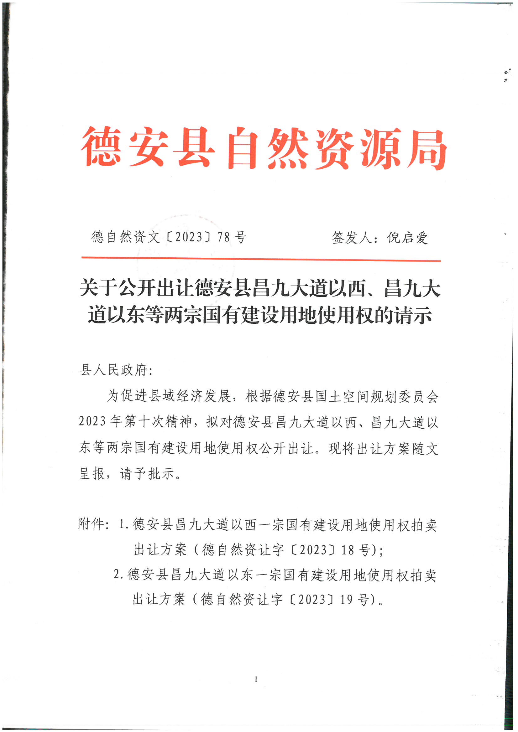 你单位呈报的《关于公开出让德安县昌九大道以西、昌九大道以东等两宗国有建设用地使用权的请示》(德自然资文〔2023〕78号)收悉。经研究,同意你单位按所呈报的《德安县昌九大道以西一宗国有建设用地使用权拍卖出让方案》(德自然资让字〔2023〕18号)、《德安县昌九大道以东一宗国有建设用地使用权拍卖出让方案》(德自然资让字〔2023〕19号)内容依法出让。