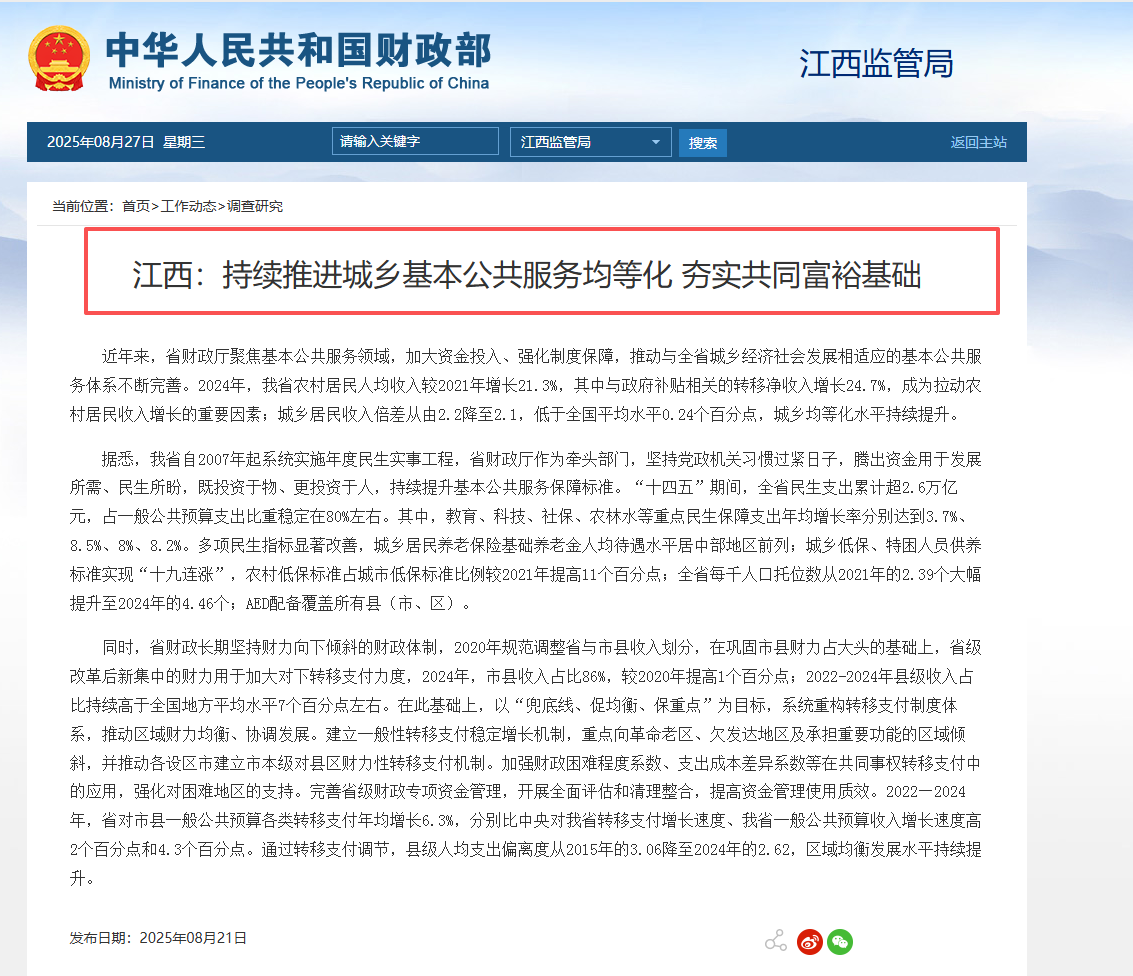 近年来,省财政厅聚焦基本公共服务领域,加大资金投入、强化制度保障,推动与全省城乡经济社会发展相适应的基本公共服务体系不断完善。2024年,我省农村居民人均收入较2021年增长21.3%,其中与政府补贴相关的转移净收入增长24.7%,成为拉动农村居民收入增长的重要因素;城乡居民收入倍差从由2.2降至2.1,低于全国平均水平0.24个百分点,城乡均等化水平持续提升。