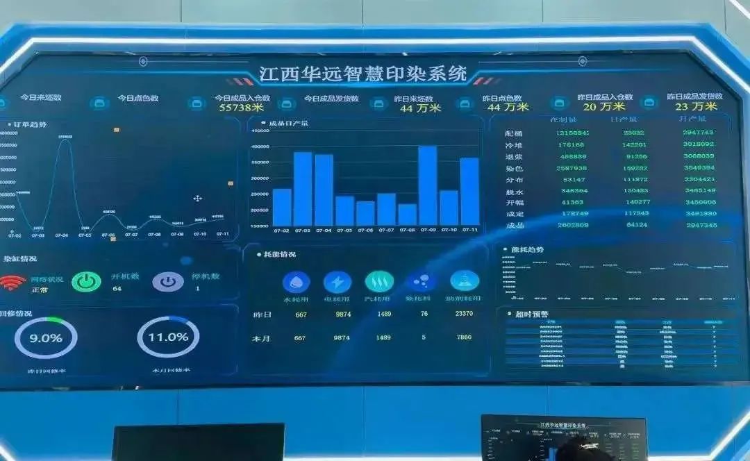作为一家总投资15.5亿元、每年可生产8000万吨精品面料的新型纺织面料加工企业,华远针织从建设初期就坚持走“信息化”与“工业化”深度融合之路。依托江西联通的技术支持,华远针织成功打造印染行业“5G数字工厂”,将物联网、大数据、人工智能等新一代信息技术应用于生产制造全过程。通过搭建印染MES工业互联网平台,企业实现了设备运行状态、染助剂投放、生产作业进度等关键环节的可视化,并对投入产出、设备效率、能源使用等业务指标通过量化分析,进行预测预警。此外,华远针织还成立了车间智慧控制中心,全面提升生产管控和绿色节能水平,不仅提升产品品质,提高了染色合格率,还显著降低了物料成本和能耗使用。