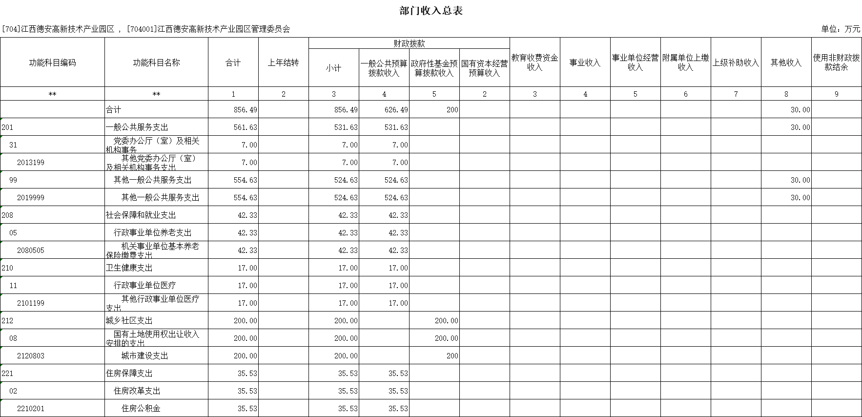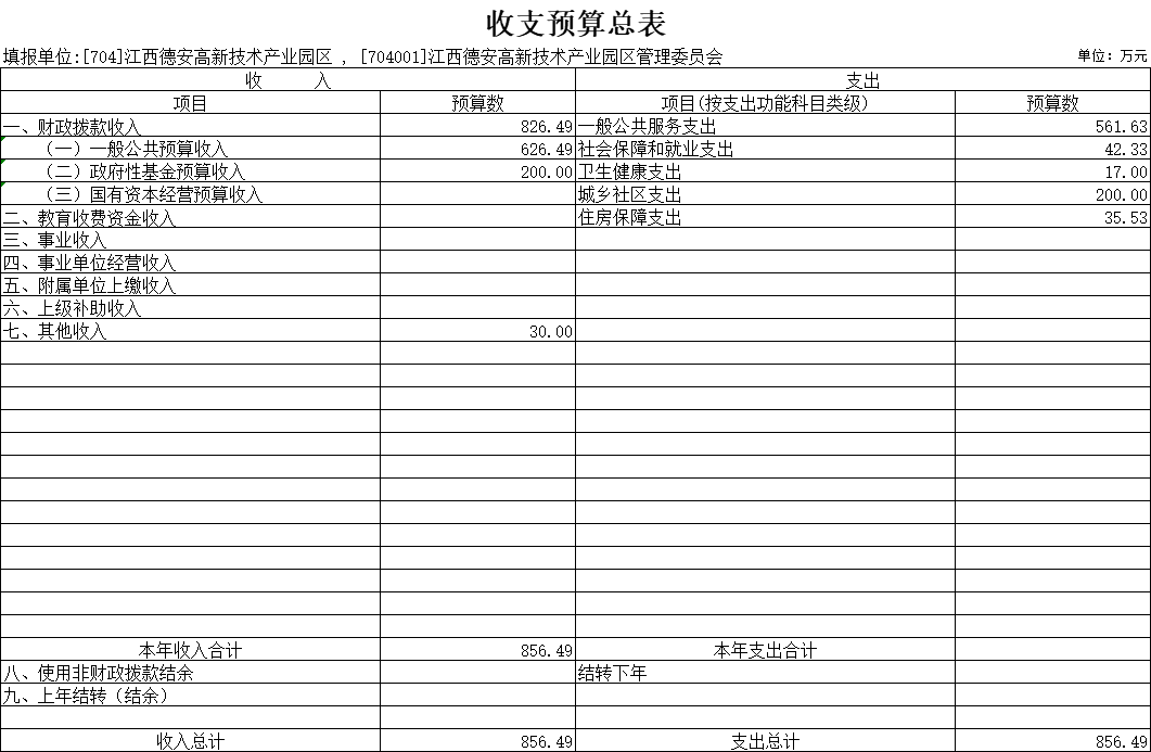 2024年德安高新技术产业园区管理委员会收入预算总额为856.49万元,较上年增加405.74万元,其中:一般公共预算拨款收入626.49万元,较上年预算安排增加175.74万元, 事业单位经营收入0万元,较上年预算安排增加0万元, 上级补助收入0万元,较上年预算安排增加0万元,其他收入30万元,较上年预算安排增加30万元。