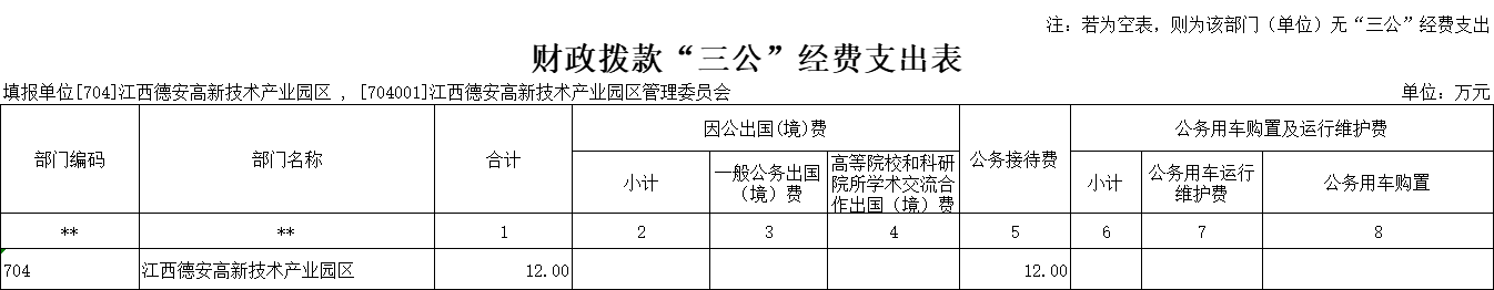 2024年德安高新技术产业园区管理委员会"三公"经费一般公共预算安排12万元,其中:公务接待费12万元,比上年增加1.9万元,主要原因是:本年增加招商团费用万,上年度没做招商团费用;因公出国(境)费0万元,与上年保持一致,主要原因是无因公出国事项。公务用车运行维护费0万元,比上年增加0万元,主要原因是:无公务用车运行维护费事项;公车购置费0万元,比上年增加0万元,主要原因是:无公务用车购置事项;