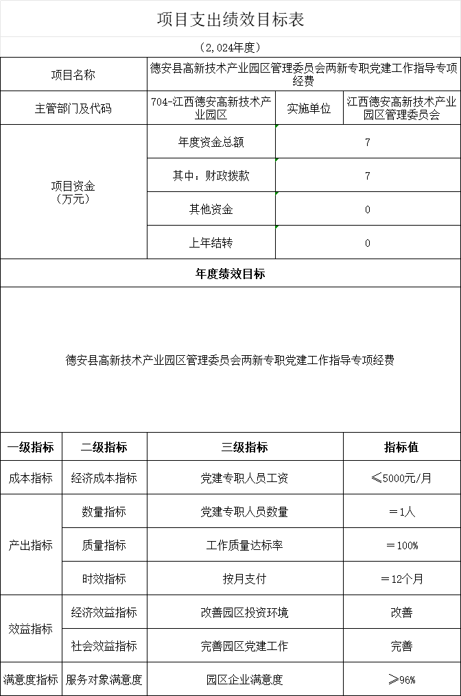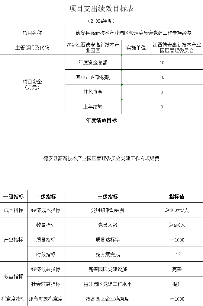 德安县高新技术产业园区管理委员会党建工作专项经费项目预算绩效目标表.xls