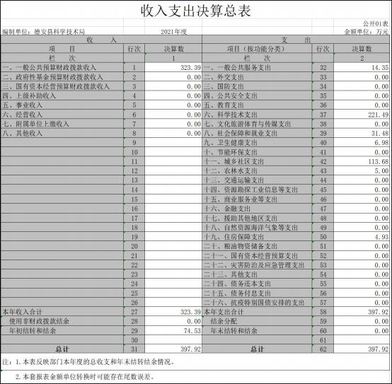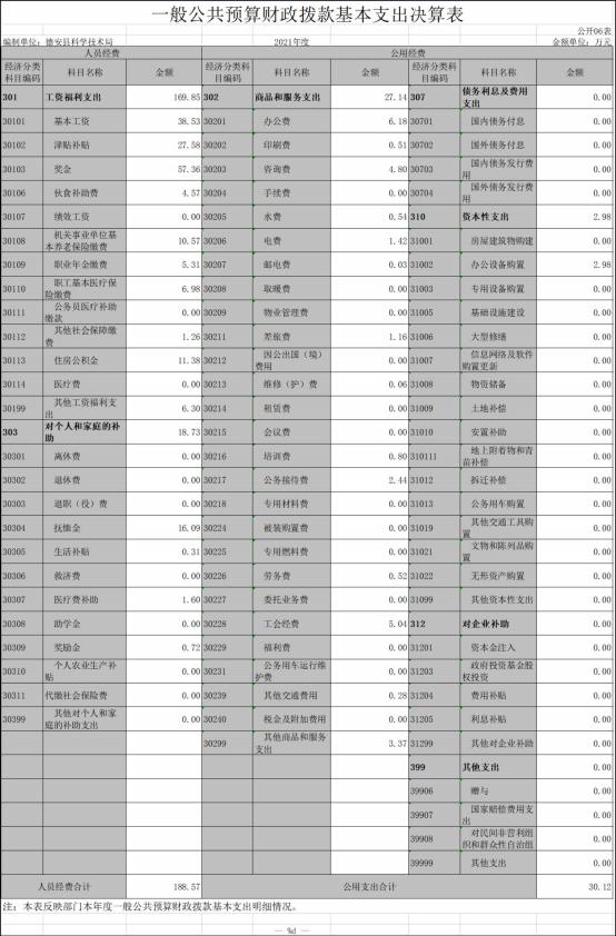 纳入本套部门决算汇编范围的单位共2个,包括:德安县科 学技术局、德安县科技创新服务中心。本部门2021年年末实有人 数10人,其中在职人员10人,离休人员0人,退休人员13人(不含由养老保险基金发放养老金的离退休人员);年末其他人员0人;年末学生人数0人;由养老保险基金发放养老金的离退休人员0人。预算执行2021年,县财政局批复我局总收支预算数为258.91万元,2021年实际整体支出258.91万元,为预算数的100 %;