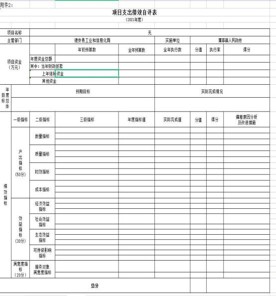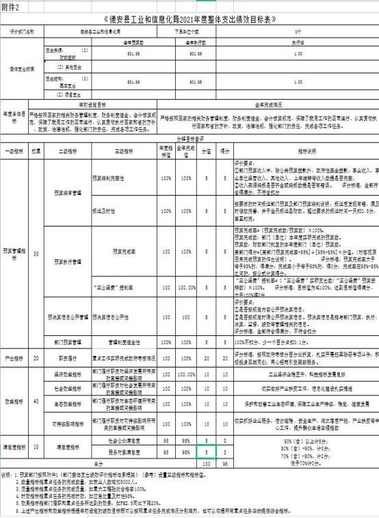 根据部门整体支出绩效评价指标规定的内容,经综合评价, 德安县工业和信息化局2021年度整体支出绩效评价分数为96分,等级为“优 ”。
