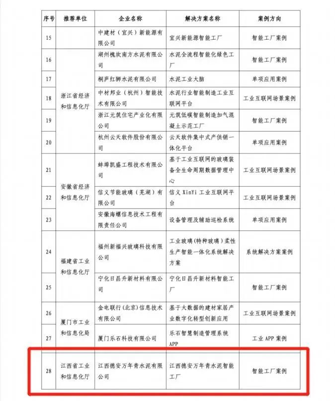 近日,经地方推荐、专家评审,工业和信息化部原材料工业司发布2022年60个建材工业智能制造数字转型典型案例,江西德安万年青水泥有限公司以智能工厂案例成为全省唯一一家成功入选的企业。
