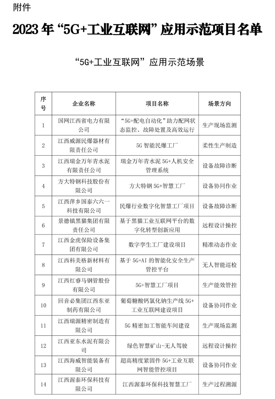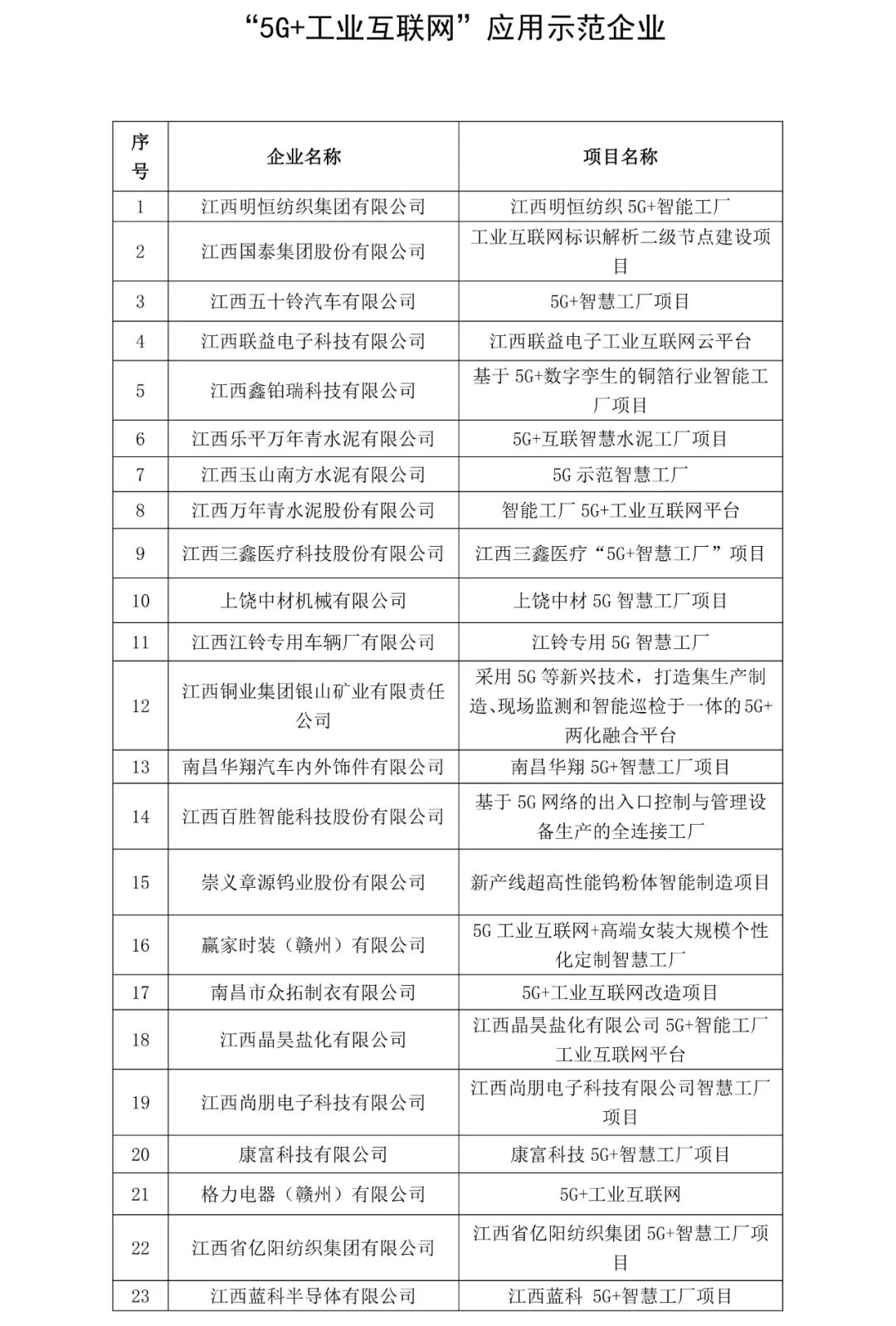 按照《江西省工业和信息化厅关于开展2023年“5G+工业互联网”应用示范工作的通知》(赣工信信推字〔2023〕88号),省工业和信息化厅组织开展了2023“5G+工业互联网”应用示范项目评审工作。现将名单予以公示,公示期为2023年7月4日至2023年7月10日,如有异议,请反馈至江西省工业和信息化厅信息化推进处。