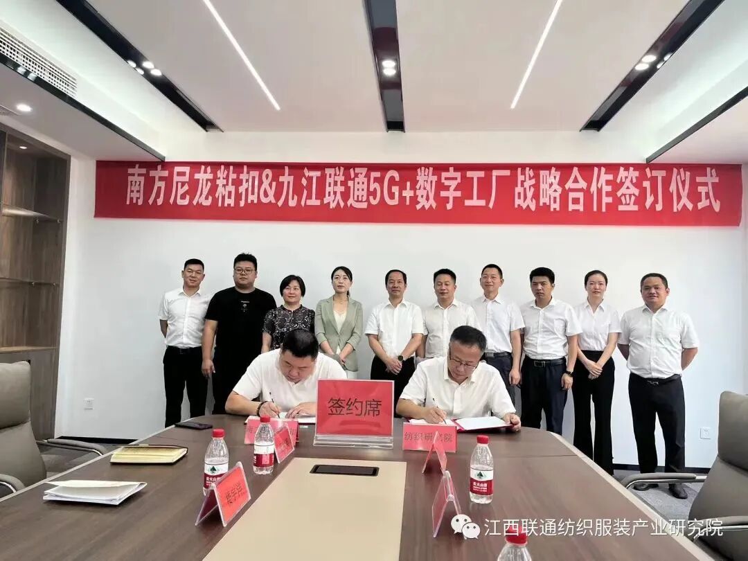 我院与江西南方尼龙粘扣有限公司在德安县丰林工业新区南方粘扣公司会议室举行5G+数字工厂项目战略合作签约仪式。德安县副县长周洁,德安县高新区管委会书记罗颖,江西南方尼龙粘扣有限公司董事长楼新涛、总经理楼宇洋,江西联通党委书记、总经理周智,江西联通工业互联网研究院院长万刚,九江联通党委书记、总经理樊平,九江联通党委委员、副总经理康健,中国联通(江西)纺织服装产业研究院院长包康俊,出席签约仪式见证签约。