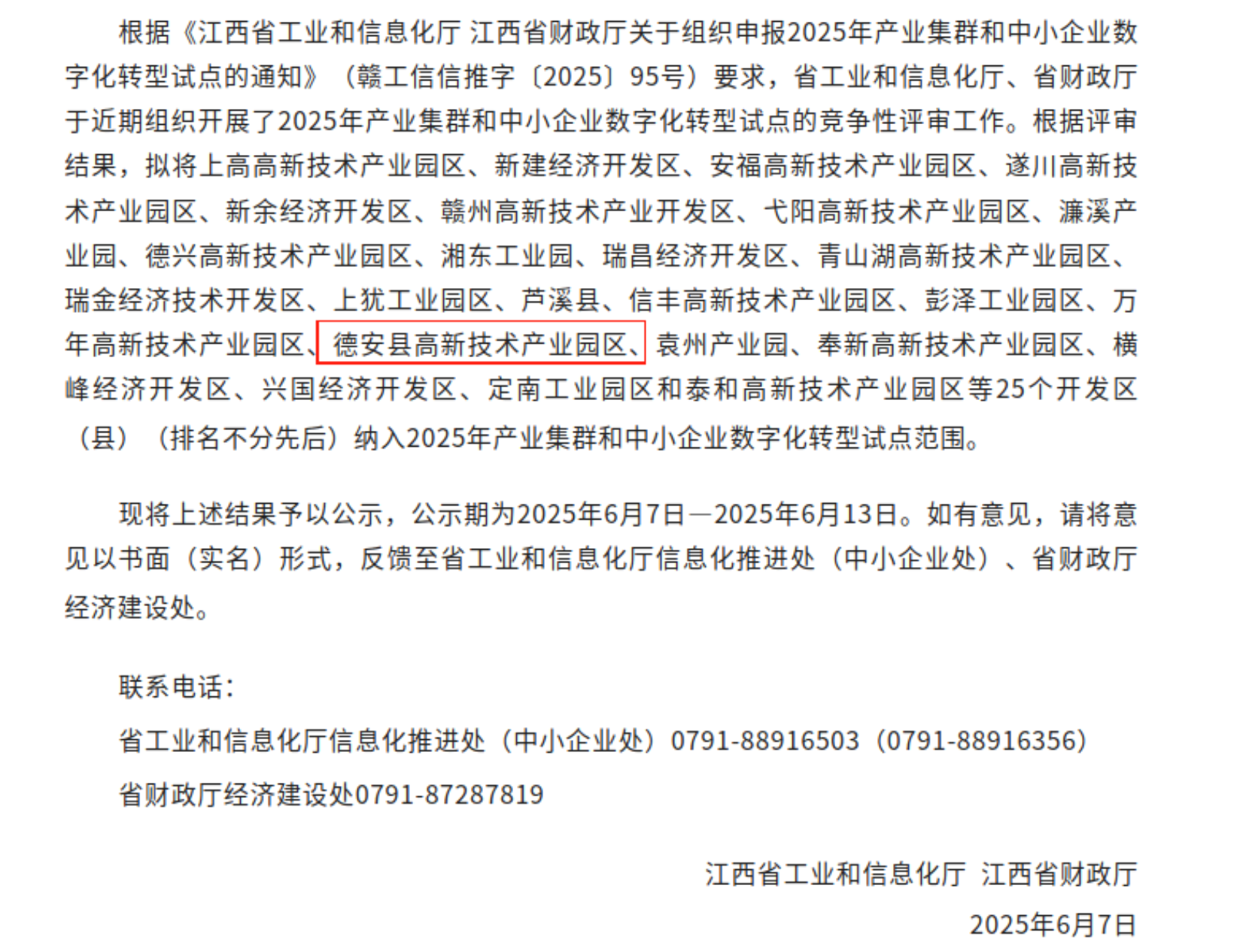 6月7日,省工业和信息化厅、省财政厅公示了2025年产业集群和中小企业数字化转型试点名单。本次试点工作采取竞争性评审,德安县高新技术产业园区成功入选“2025年产业集群和中小企业数字化转型试点”公示名单。