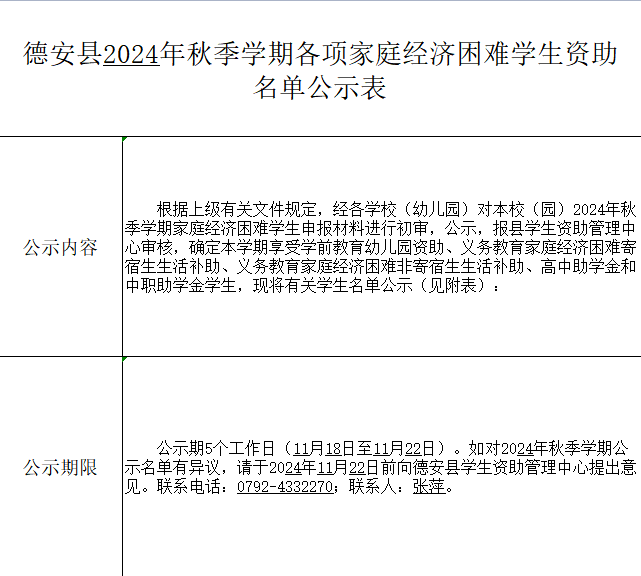 德安县2024年秋季学期各项家庭经济困难学生资助名单公示