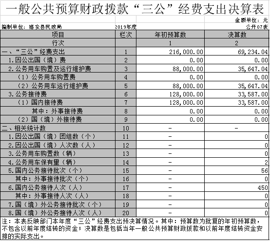 本部门2019年度一般公共预算财政拨款“三公”经费支出年初预算数为21.6万元,决算数为6.92万元,完成年初预算的32.04%,决算数较2018年减少3.57万元,下降34.03%,其中: