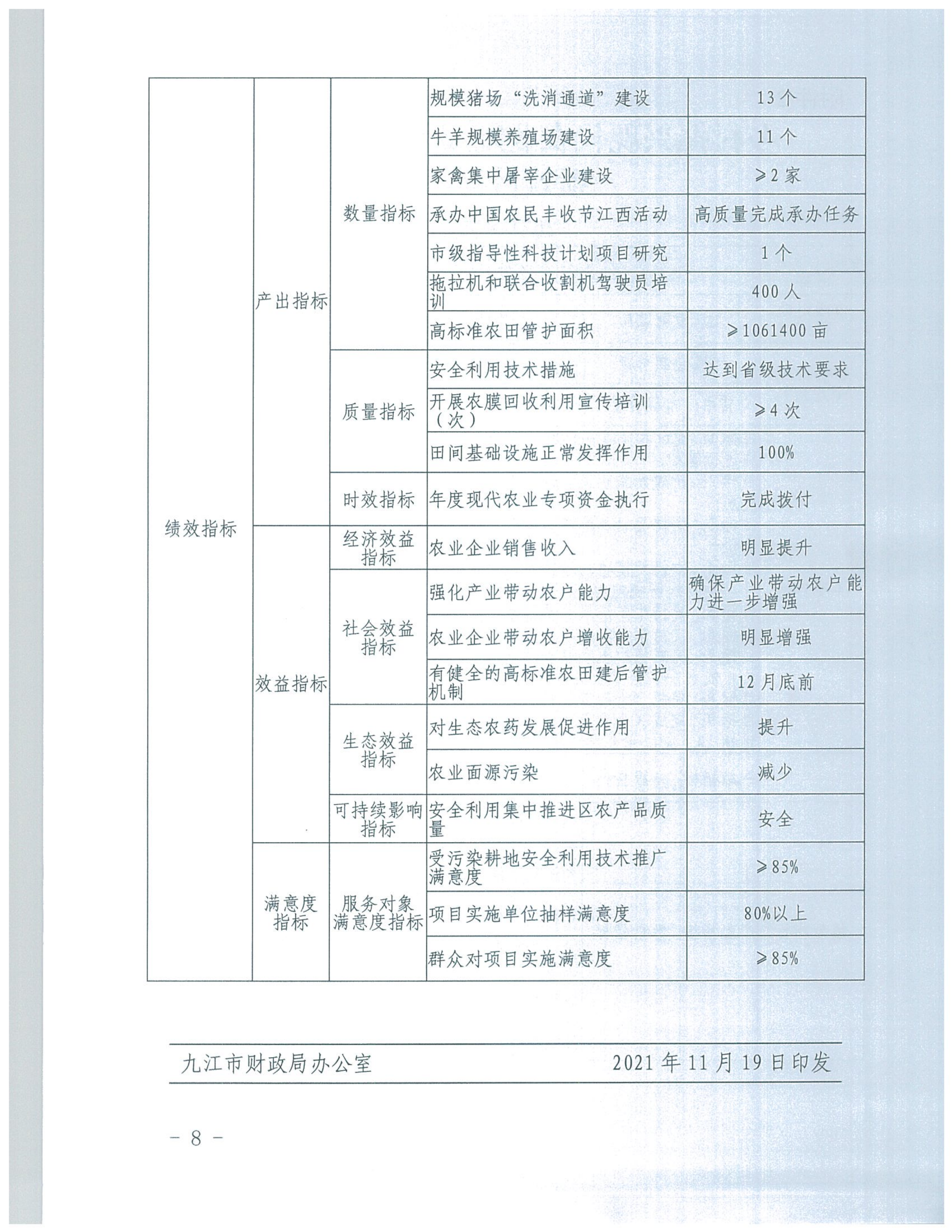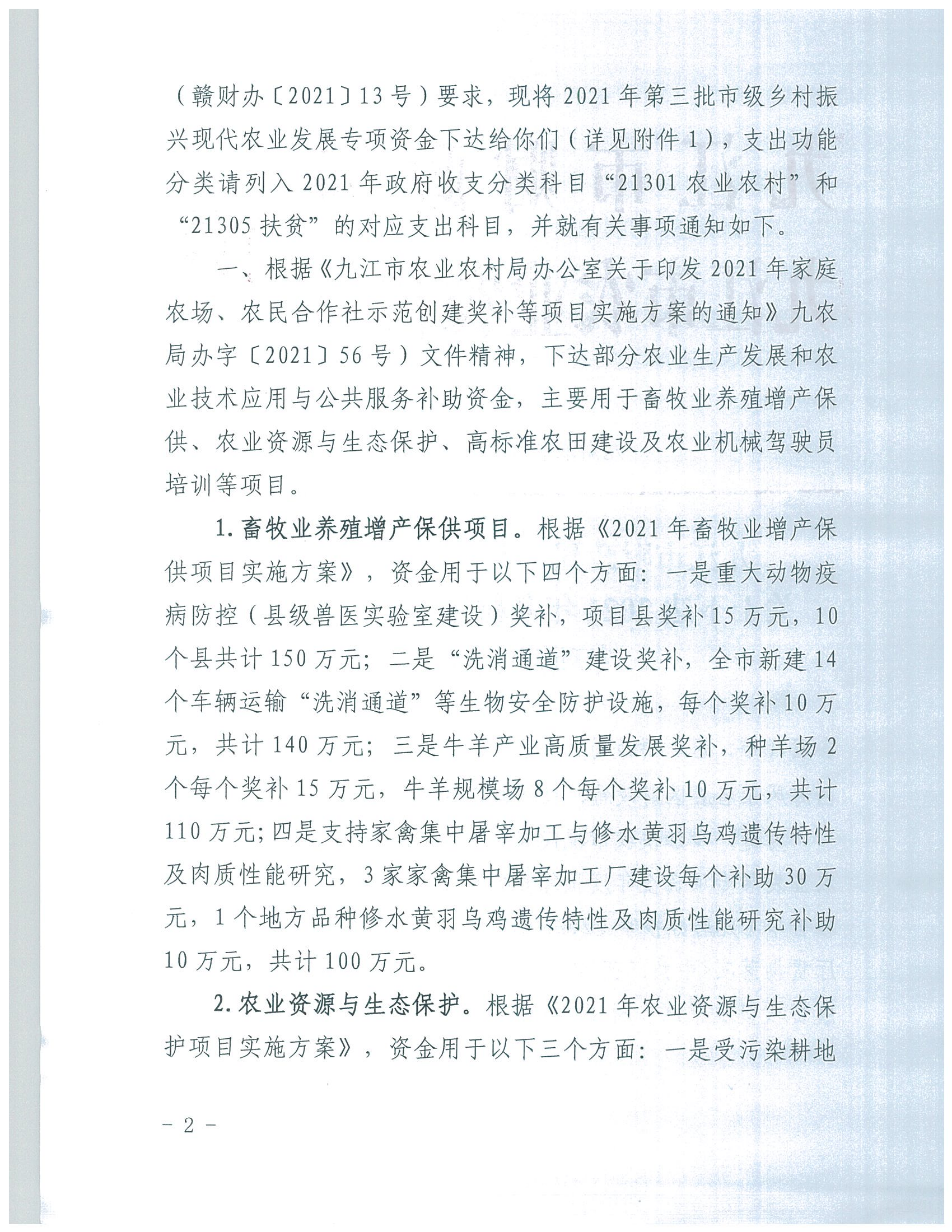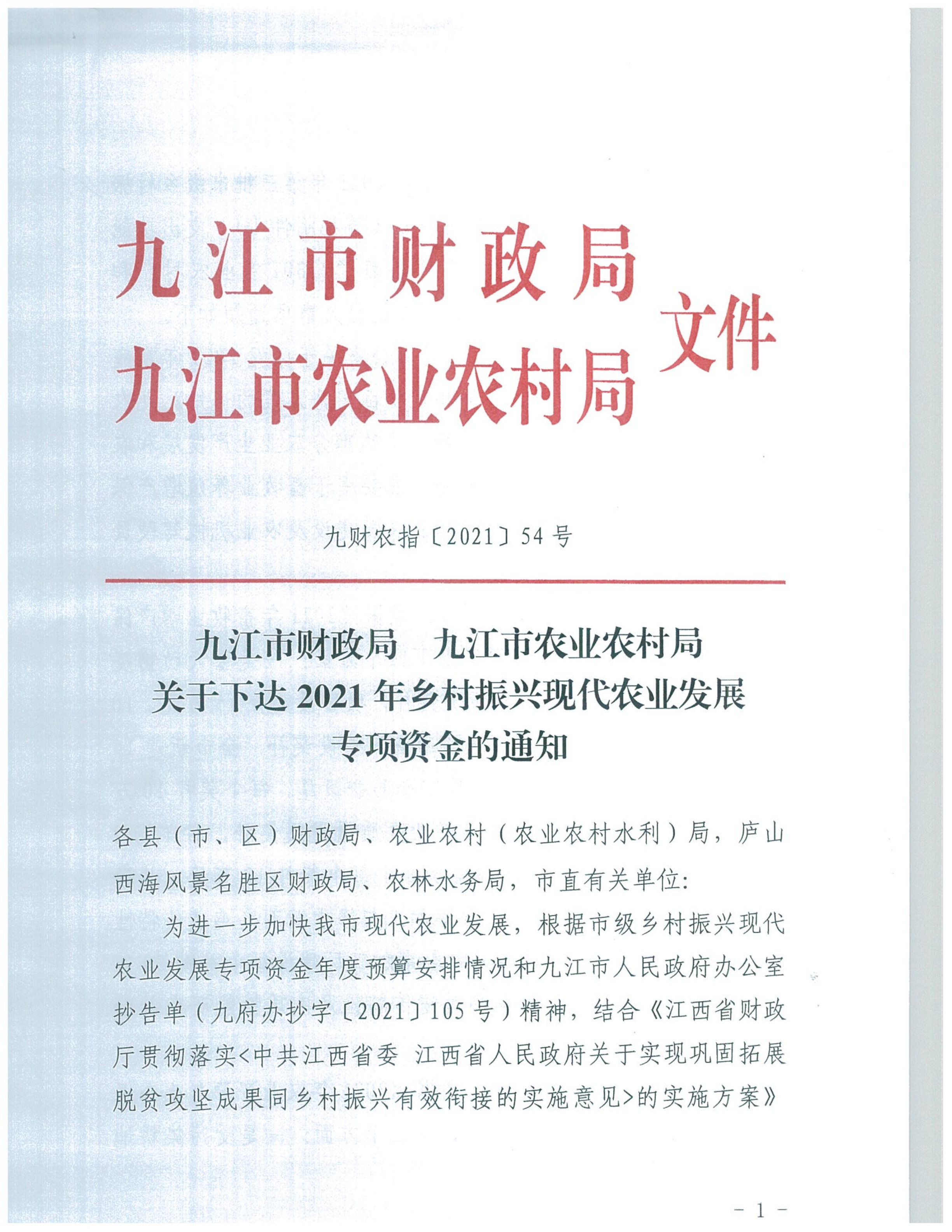 关于下达2021年乡村振兴现代农业发展专项资金的通知(九财农指〔2021〕54号)