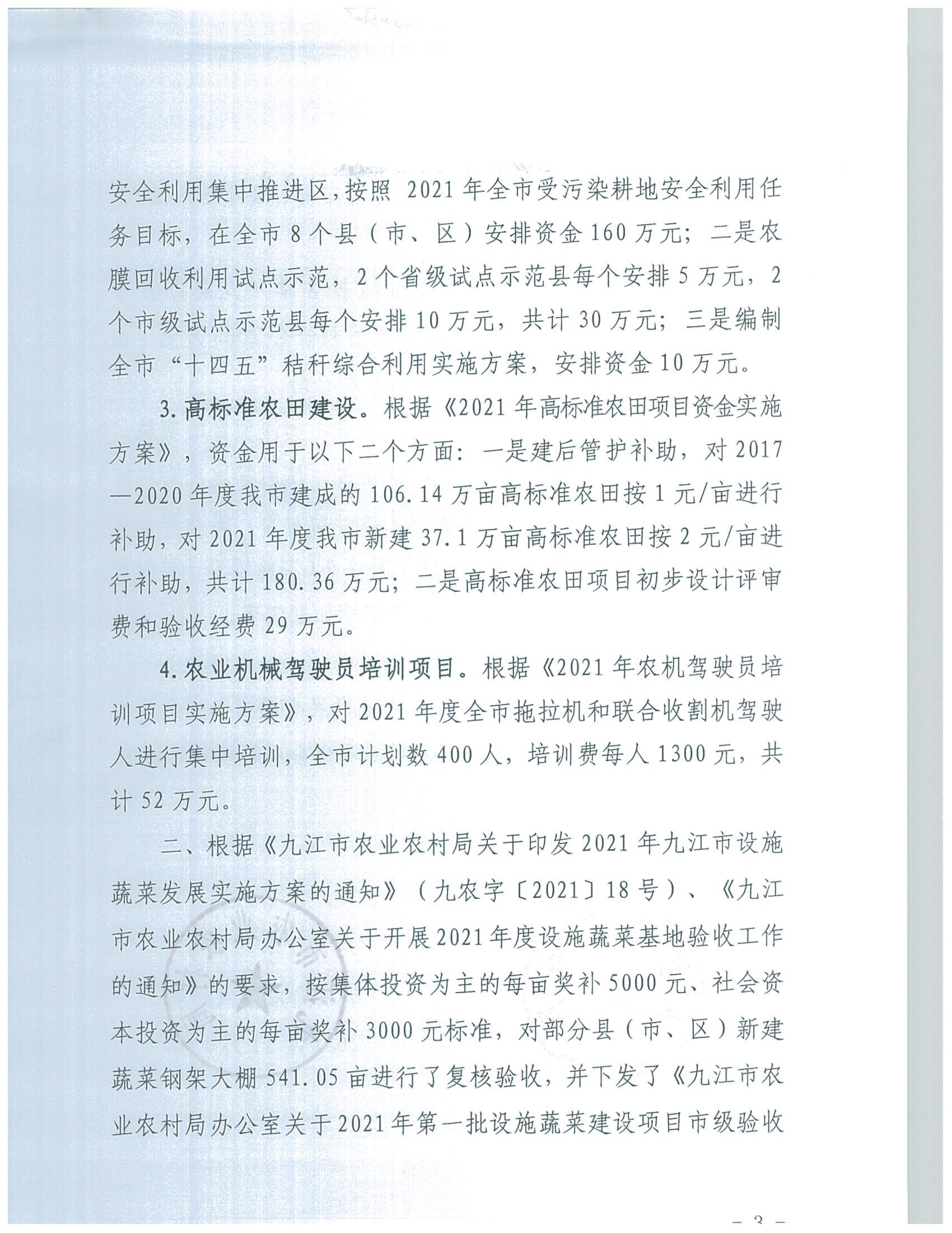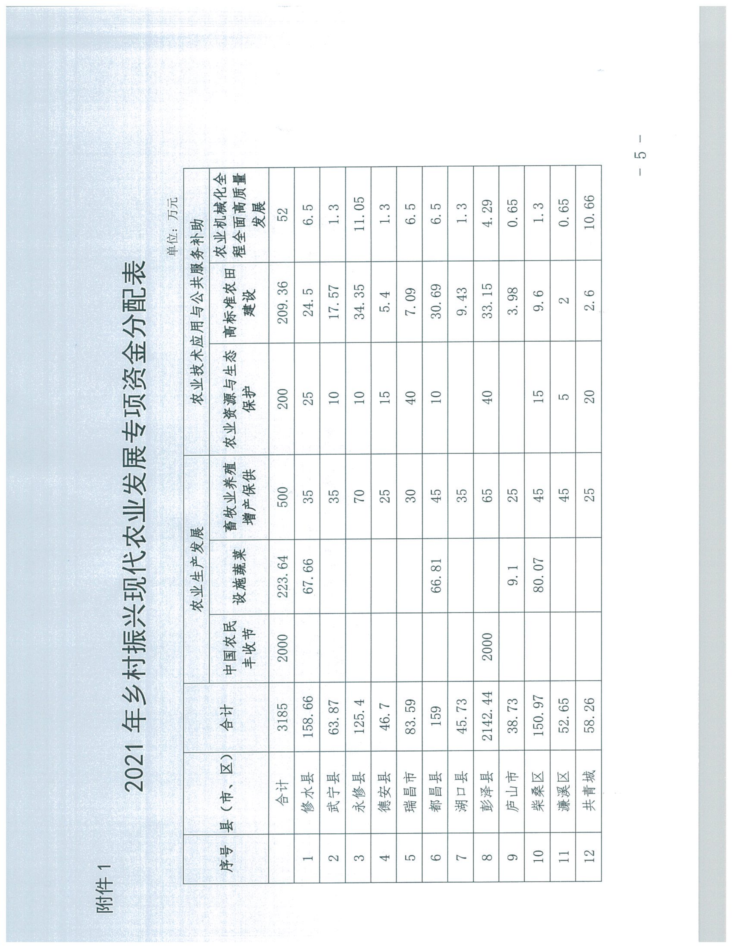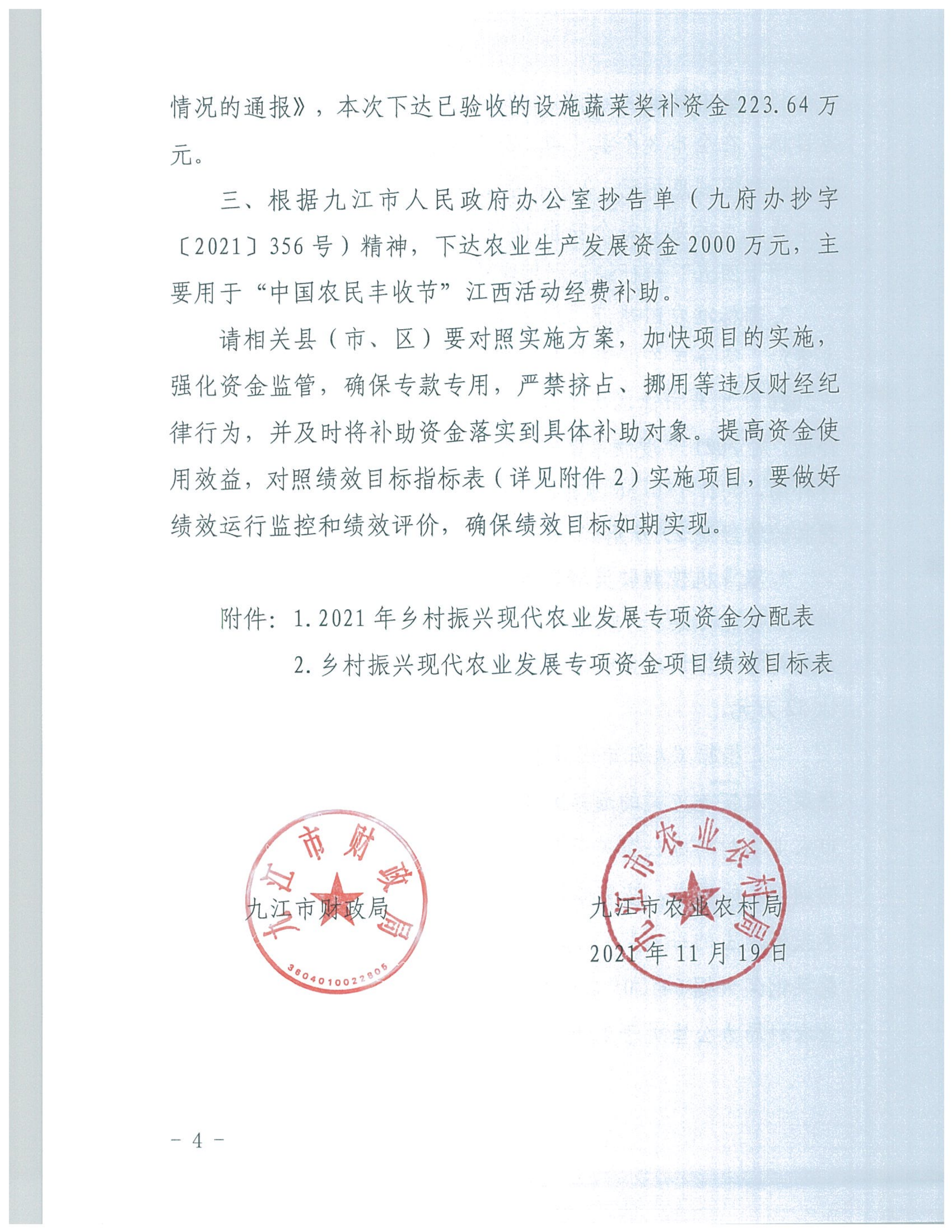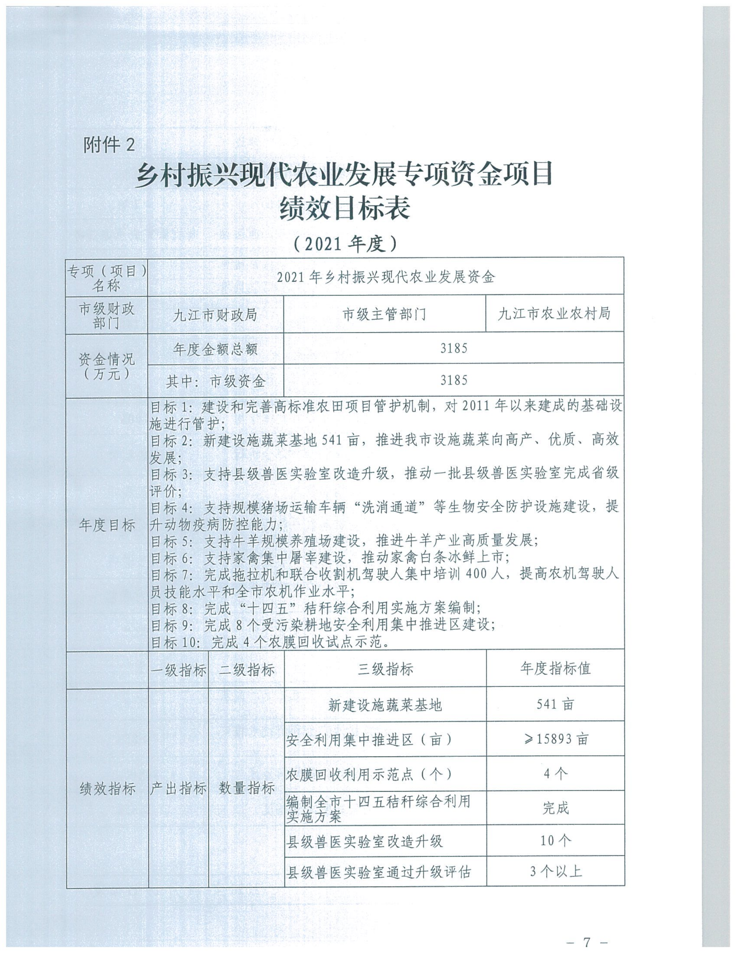 关于下达2021年乡村振兴现代农业发展专项资金的通知(九财农指〔2021〕54号)