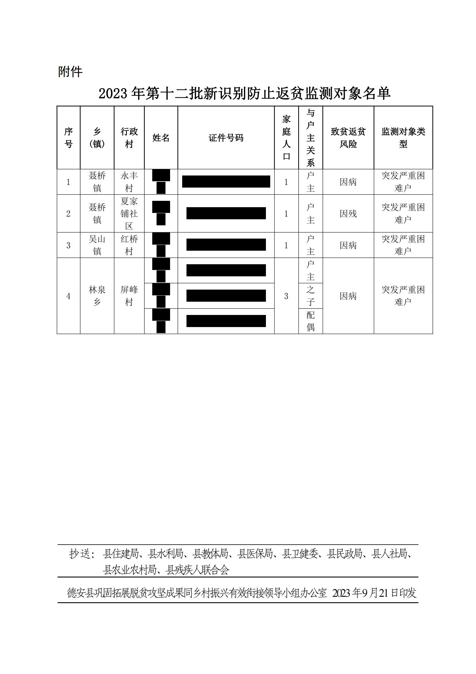 你们上报的《关于复审防止返贫监测对象的报告》已收悉,经县乡村振兴局汇总、审核,现同意徐良兴等4户6人为防止返贫监测对象。请按照《关于健全防止返贫动态监测和帮扶机制的实施方案》(德党农字〔2021〕1号)文件要求,在乡村两级进行公告,及时录入全国防返贫监测信息系统,并落实好结对帮扶干部,采取针对性措施开展帮扶,实现徐良兴等4户监测对象的生活得到明显改善。