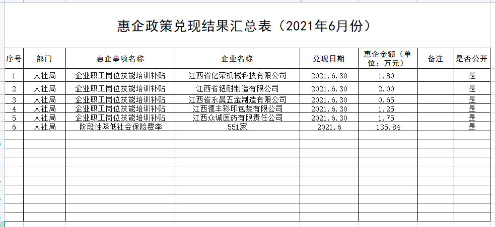 德安县人社局惠企政策兑现结果汇总表(2021年6月份)