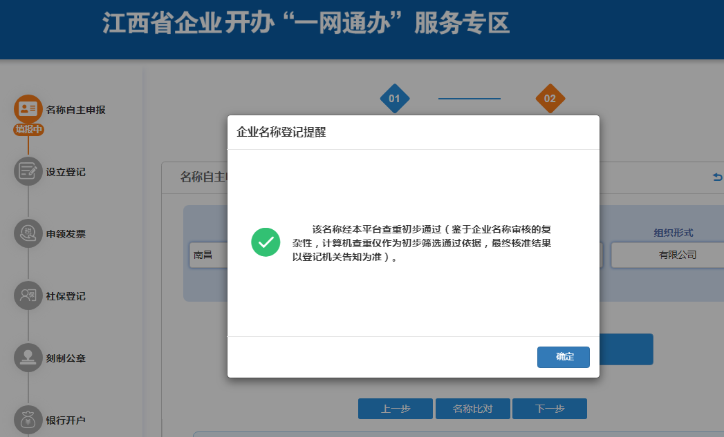 点击名称比对,系统会自动将该名称与全省现有企业名称库进行比对,如提示不通过,请更换字号或行业表述再次进行名称比对。提示通过的页面如下: