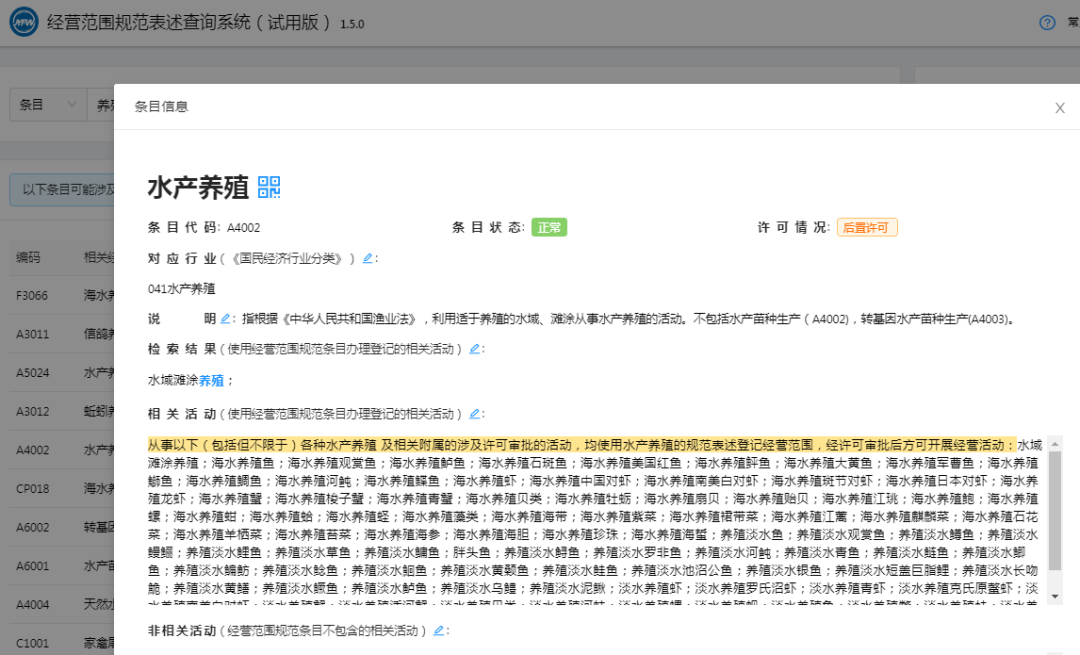 为方便申请人准确选择想要的经营范围表述条目,点击详情可查看该条目下的细化经营项目描述(以水产养殖为例):
