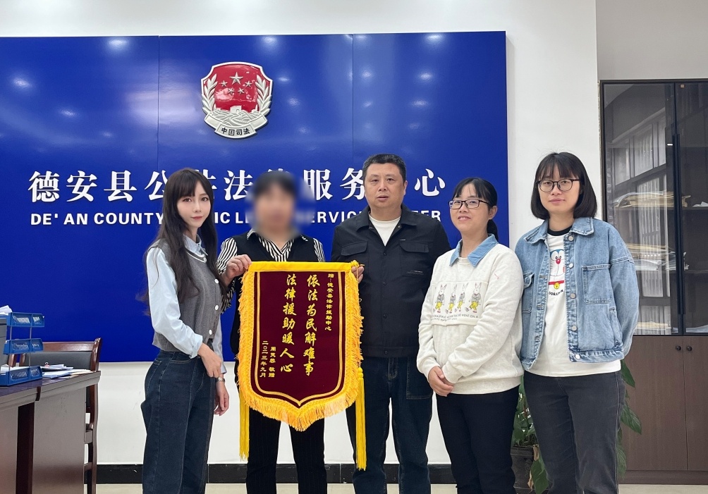“谢谢你们!多亏了你们法律上的帮助,太感谢法律援助中心了!”近日,江西省九江市德安县林泉乡大溪畈村村民周某将一面印有“依法为民解难事 法律援助暖人心”的锦旗送到了该县司法局公共法律服务中心,表达内心的感激之情。