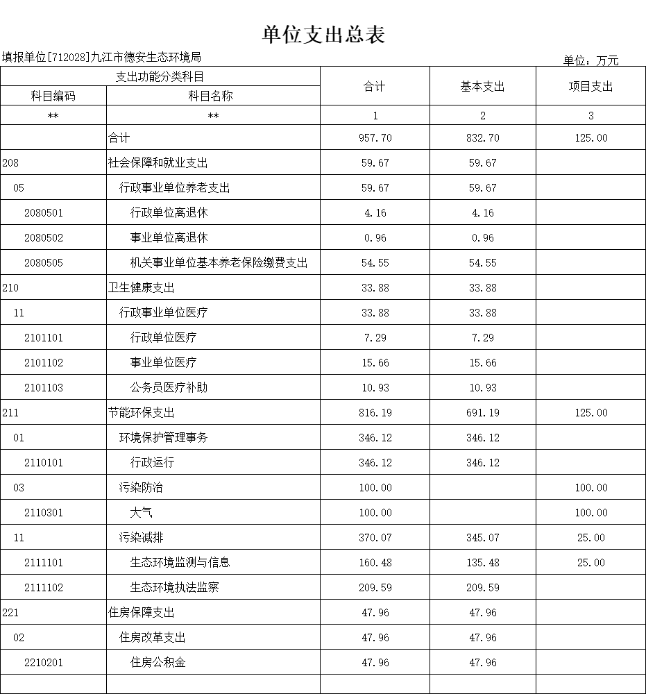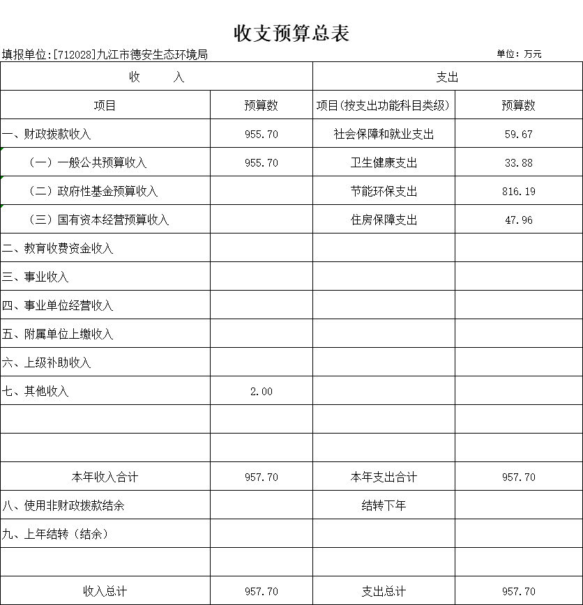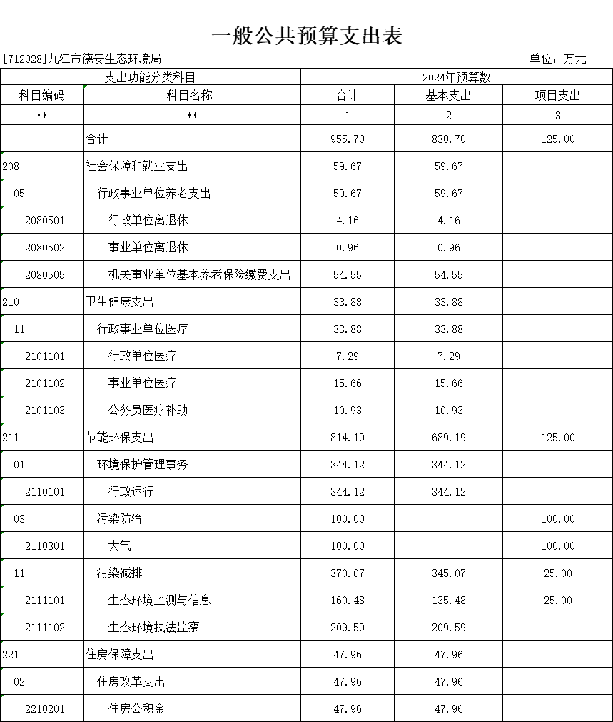 2024年九江市德安生态环境局支出预算总额为957.7万元,较上年预算安排增加124.38万元;其中: