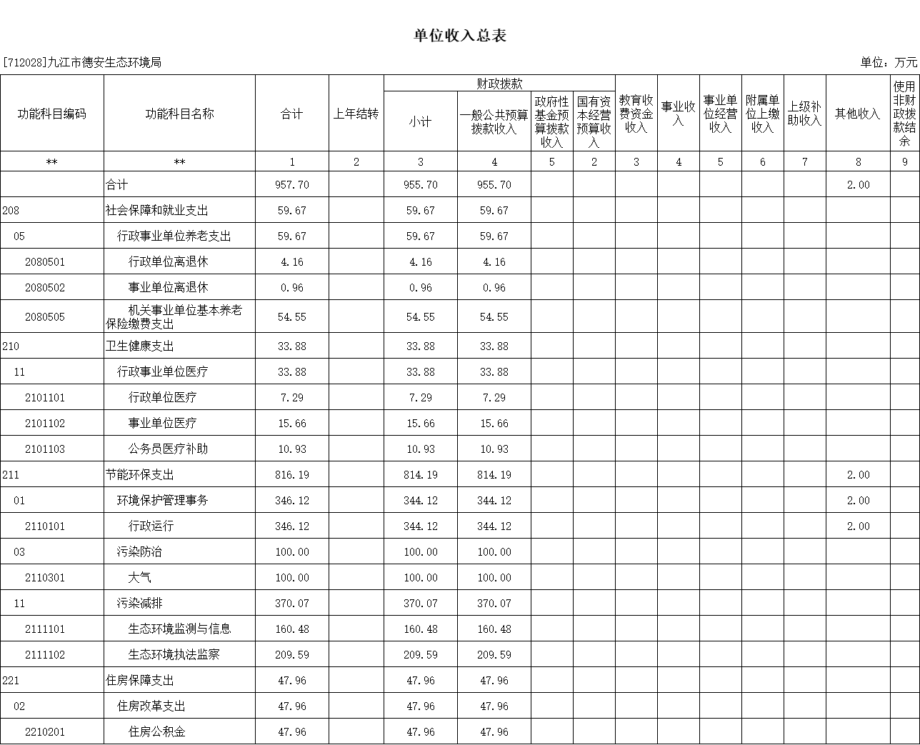 2024年九江市德安生态环境局收入预算总额为957.7万元,较上年预算安排增加124.38万元; 财政拨款收入955.7万元,较上年预算安排增加122.38万元,国库集中支付网上结转0万元,较上年预算安排增加0万元;其他收入2万,较上年预算安排增加2万元。
