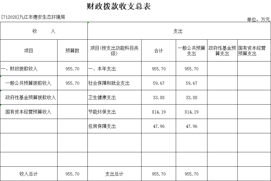 2024年九江市德安生态环境局财政拨款支出预算总额955.7万元,较上年预算安排增加122.38万元;