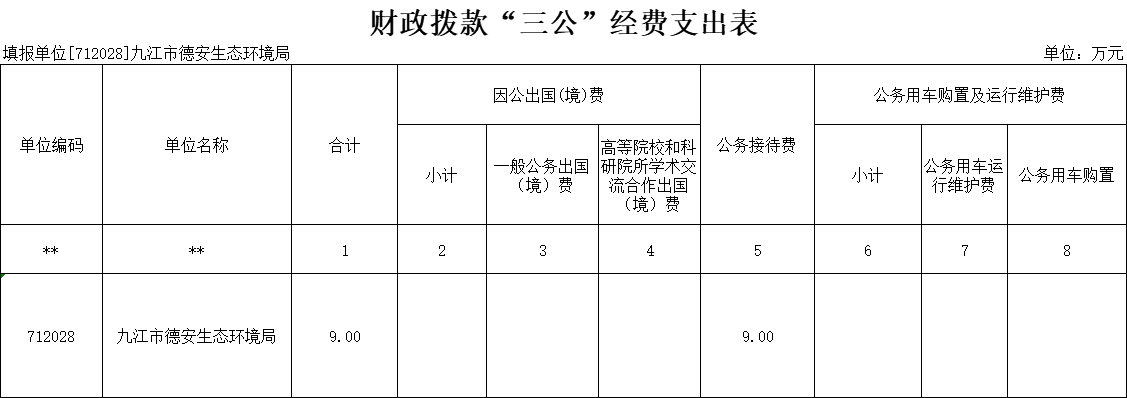 2024年九江市德安生态环境局"三公"经费财政拨款安排9万元,其中: