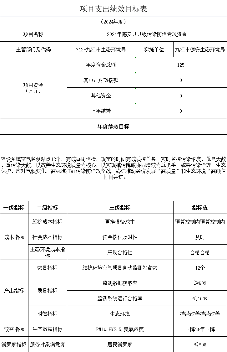 绩效目标:建设乡镇空气监测站点12个,完成每周巡检,规定的时间完成质控任务,实时监控污染浓度、优良天数、重污染天数,以改善生态环境质量为核心,以实现减污降碳协同增效为总抓手,统筹污染治理,生态保护、应对气候变化,高标准打好污染防治攻坚战,终深推动经济发展“高质量”和生态环境“高颜值”协同并进。
