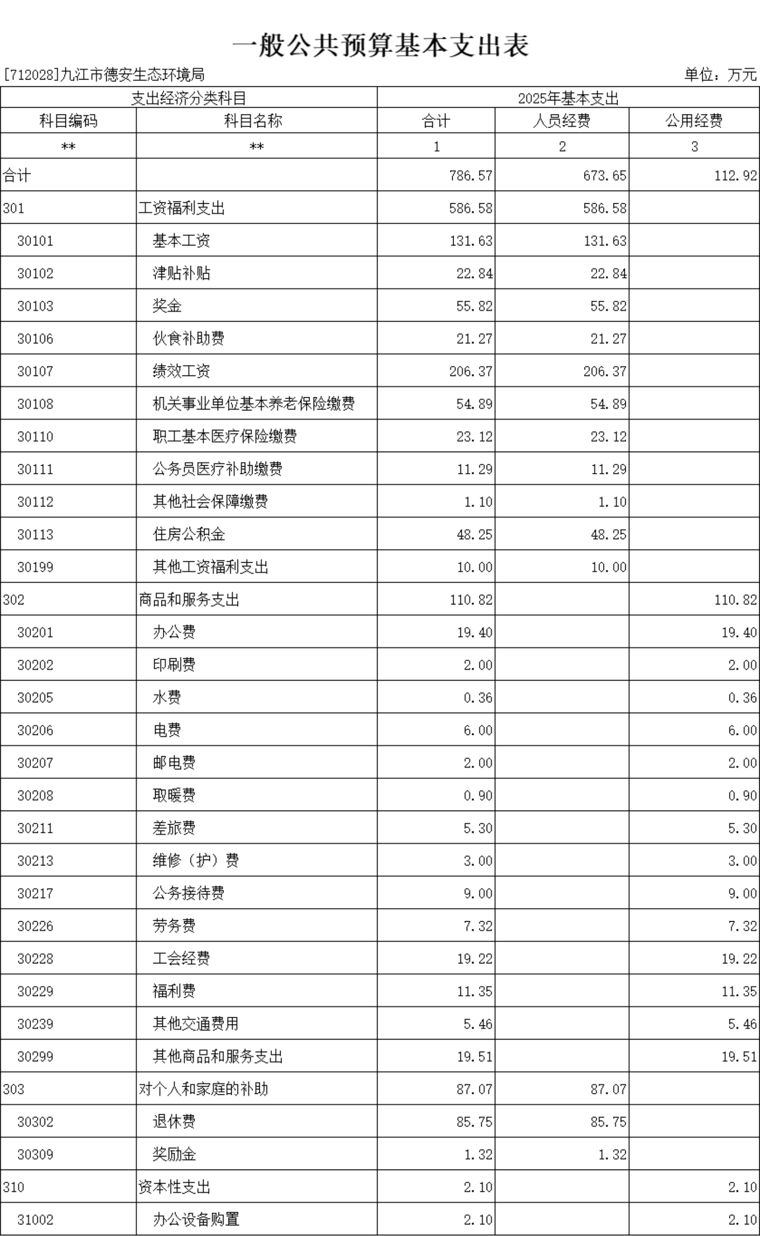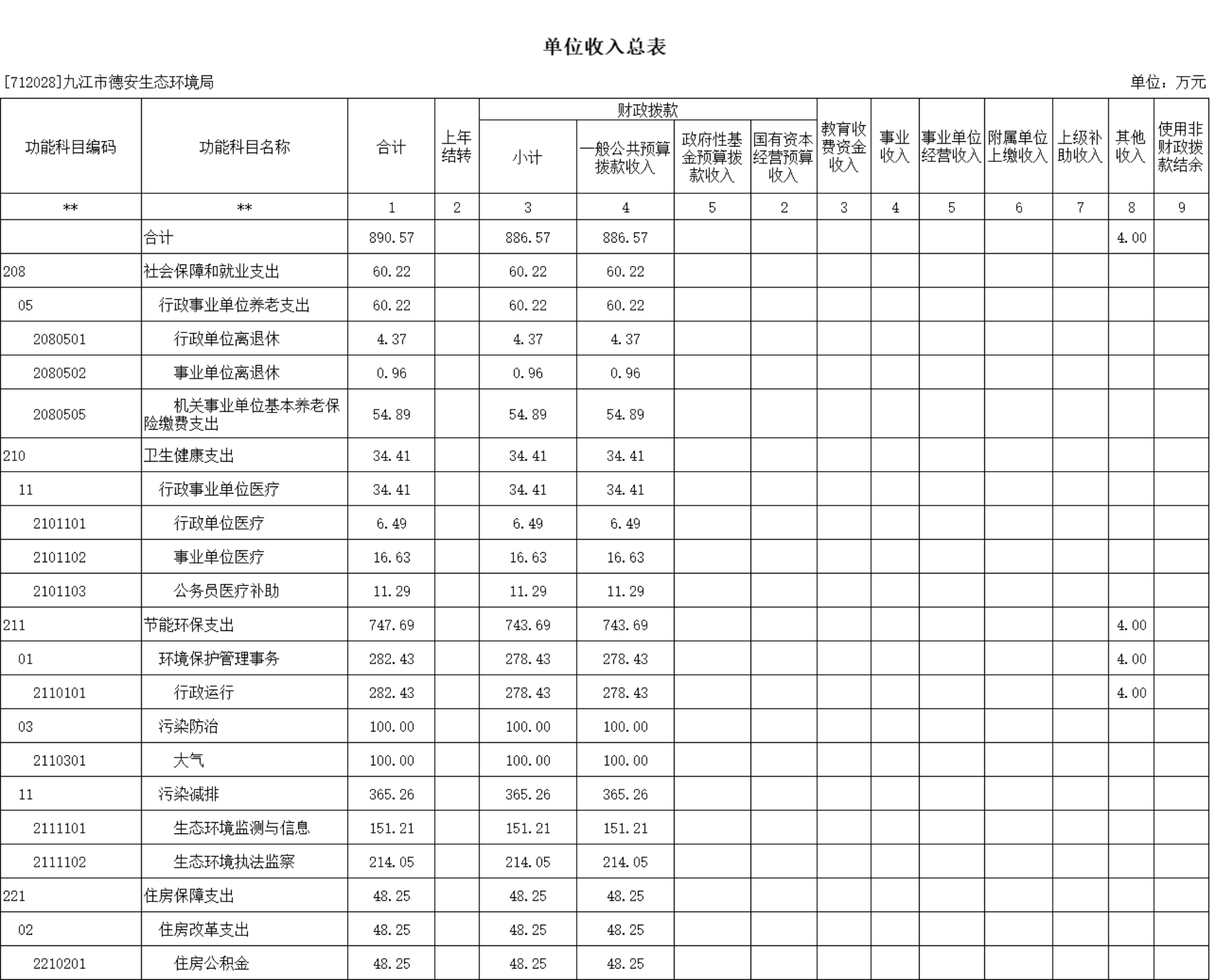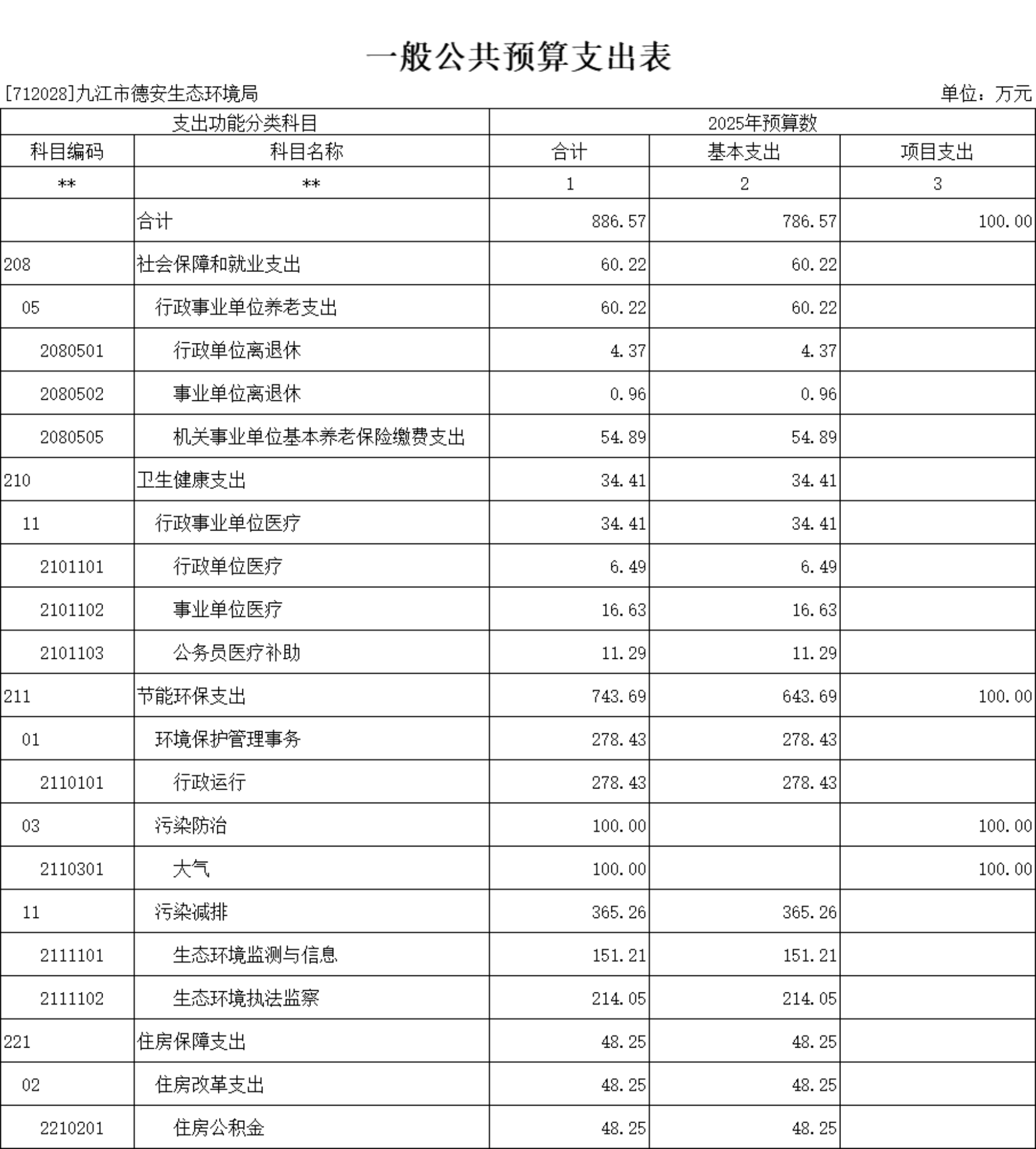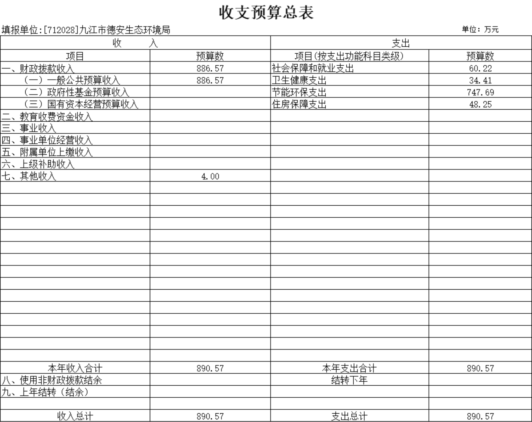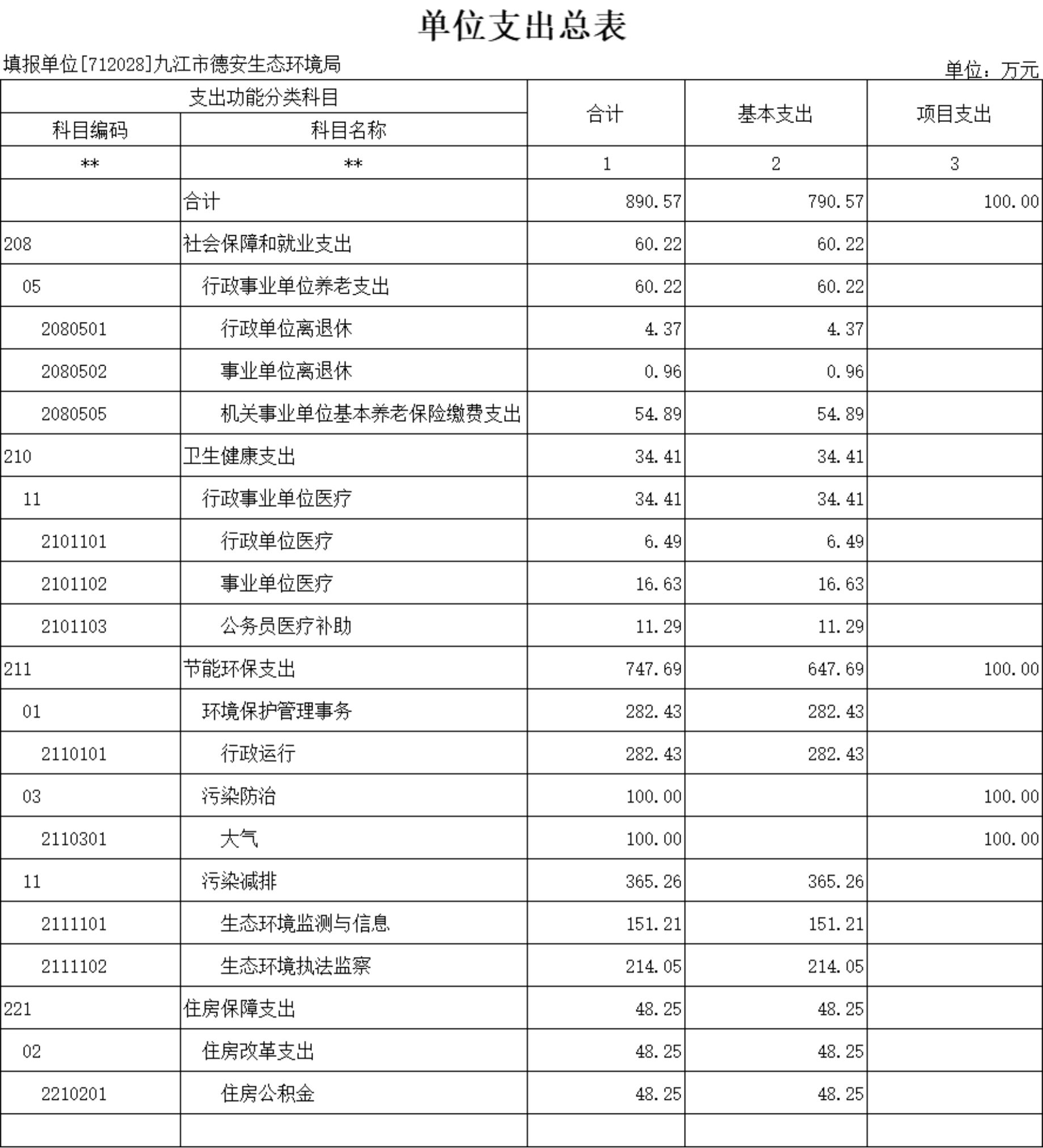 2025年九江市德安生态环境局支出预算总额为890.57万元,较上年预算安排减少67.13万元;其中: